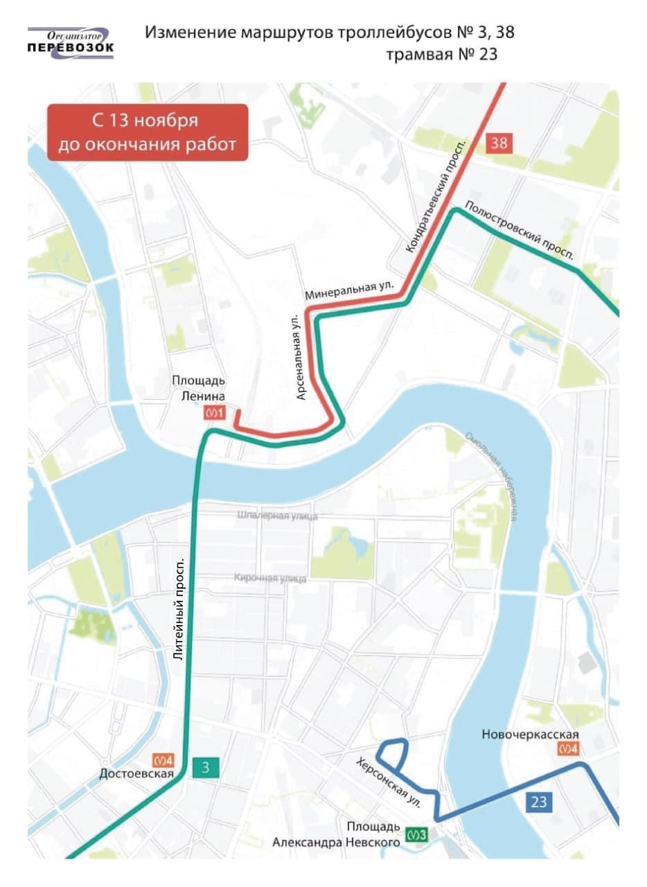 В связи с ремонтом трамвайных путей с 01:30 13 ноября до окончания работ закрывается трамвайное и троллейбусное движение по Кондратьевскому проспекту от Арсенальной улицы до Минеральной улицы.
