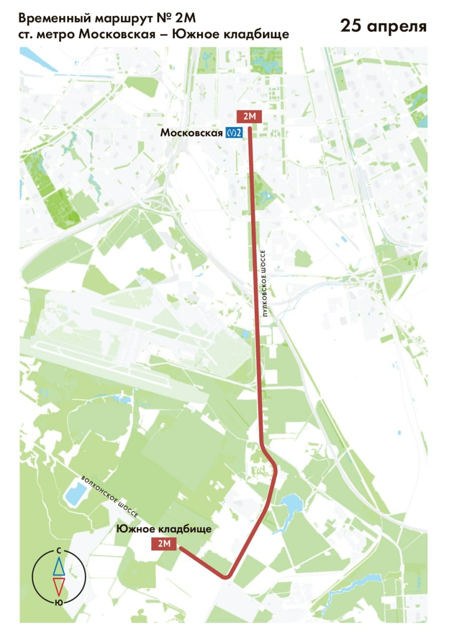 - открывается временный экспресс-маршрут № 2М «Метро «Московская» - Южное кладбище» (трасса маршрута - на схеме). Интервал движения составит 10-12 минут; первый рейс отправится от ст. метро «Московская» в 8:00, последний рейс от Южного кладбища в 17:00.