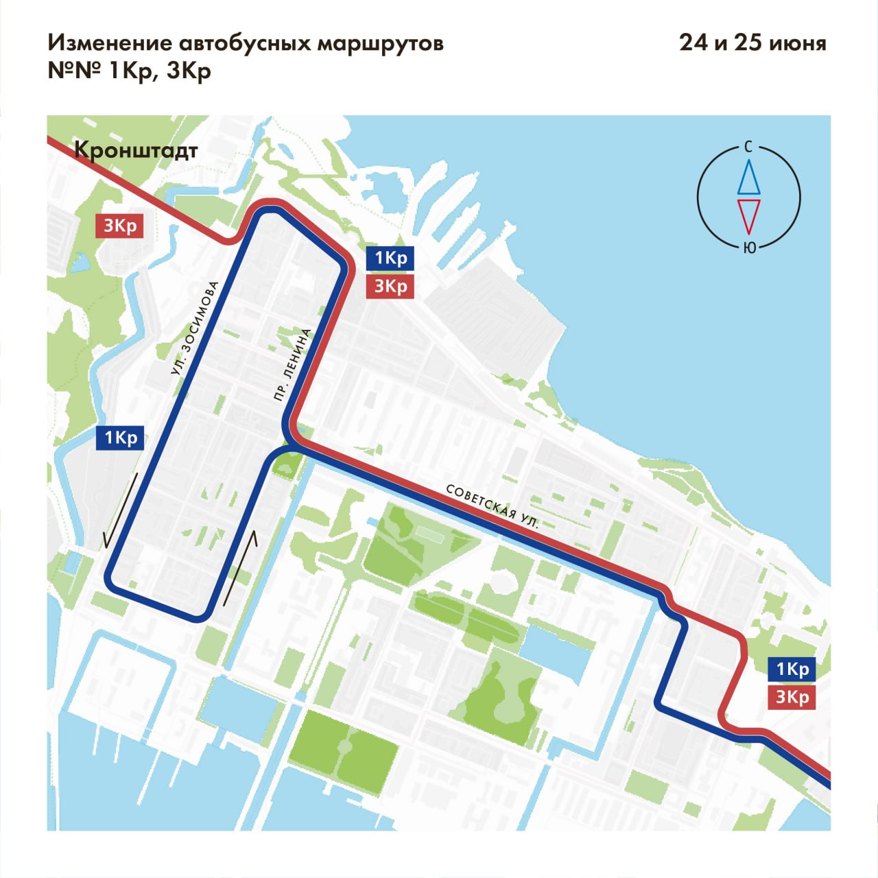 Уважаемые петербуржцы! Информируем! 24 и 25 июня в связи с проведением XI Международного военно-морского салона вносятся изменения в трассы автобусных маршрутов: №№ 1Кр, 3Кр.