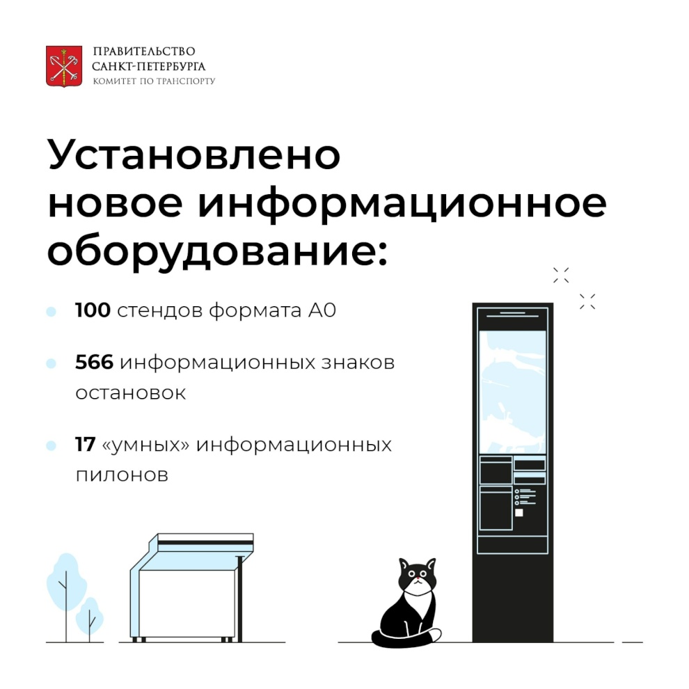 За полгода установлено 100 стендов формата А0, 566 информационных знаков остановок и 17 «умных» информационных пилонов, которые оснащены встроенным светодиодным электронным табло и/или LED-подсветкой. «Умные» пилоны в автоматическом режиме обмениваются данными через интернет с Порталом общественного транспорта Санкт‑Петербурга, благодаря чему пассажиры в режиме реального времени могут узнать время прибытия транспорта на остановку.