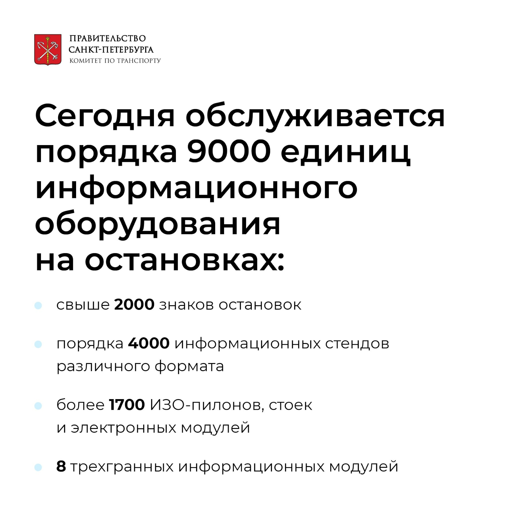 Всего ГКУ «Организатор перевозок» сегодня обслуживает порядка 9000 единиц информационного оборудования, размещённого на остановочных пунктах наземного городского пассажирского транспорта. В том числе, свыше 2000 знаков остановок, порядка 4000 информационных стендов различного формата, более 1700 ИЗО-пилонов, стоек и электронных модулей, 8 трехгранных информационных модулей.
