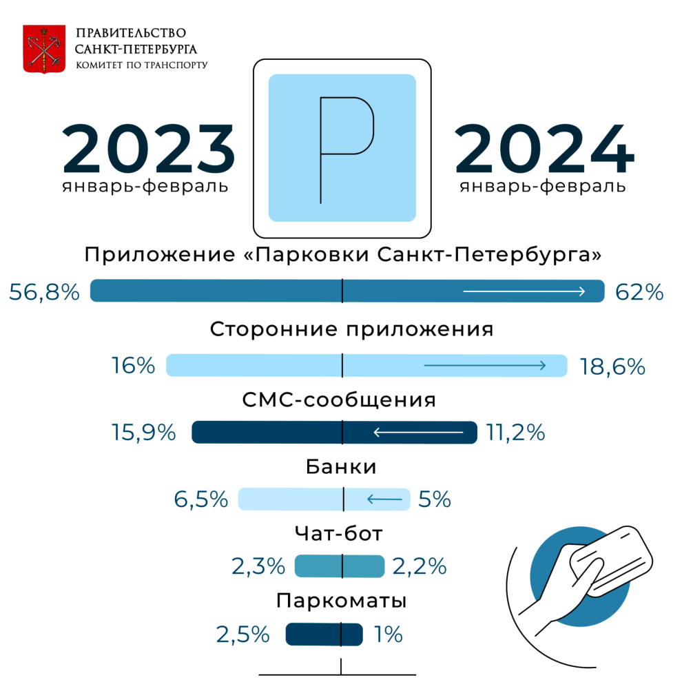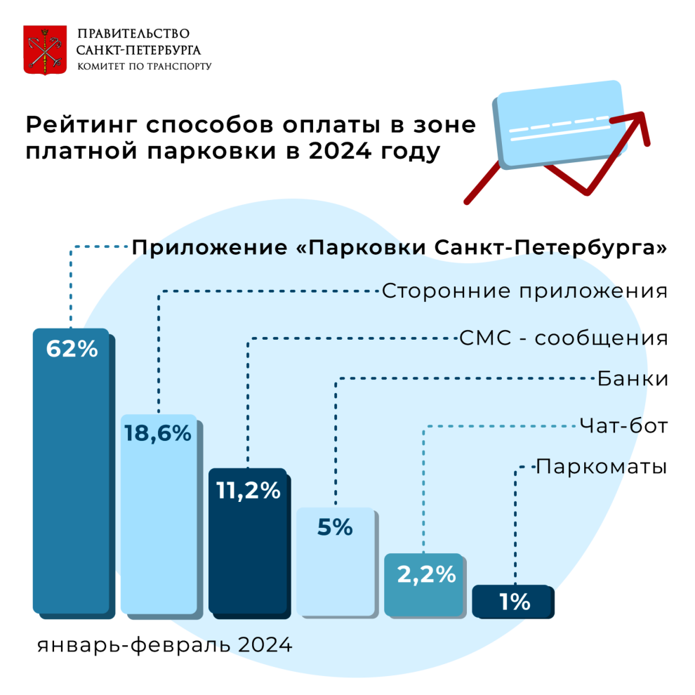 В целом приложение «Парковки Санкт‑Петербурга» сегодня - основной способ, которым жители нашего города предпочитают оплачивать стоянку в зоне платного парковочного пространства: 62 % оплат приходится на этот сервис.