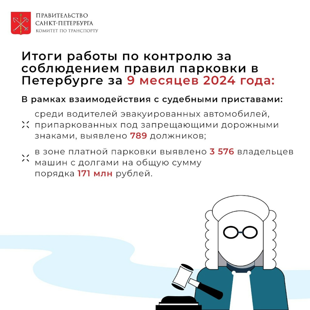 Так, по статье 20.25 КоАП РФ Комитетом по транспорту в адрес мировых судей за три квартала 2024 года направлено 70 616 протоколов за уклонение от исполнения ранее наложенных административных наказаний.