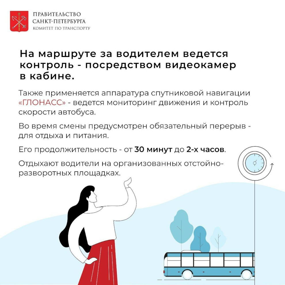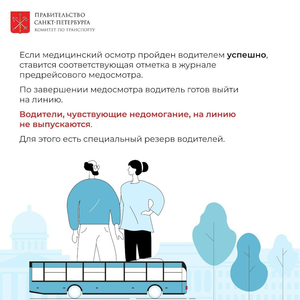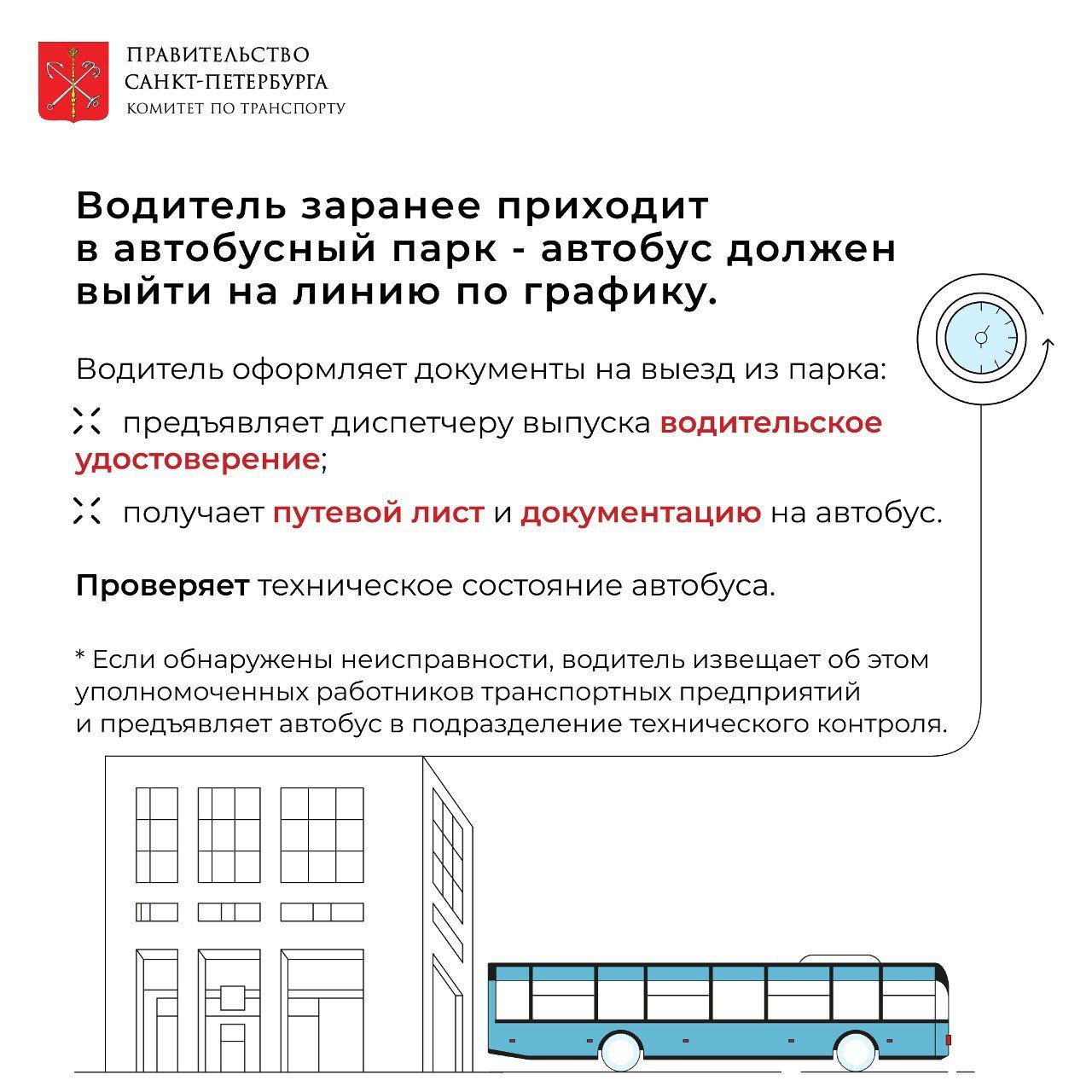 Весь водительский состав для работы на маршрутах общественного транспорта в Петербурге принимается перевозчиками в строгом соответствии с трудовым законодательством России. Каждый водитель наземного транспорта имеет водительские права необходимой категории, в частности водители автобуса - права категории «Д». Кроме того, каждый сотрудник независимо от стажа вождения и работы водителем проходит обязательную трехступенчатую подготовку. Она включает в себя теоретическую и практическую части, а также стажировку на линии - с пассажирами и без них. По результатам прохождения всех этапов подготовки каждый водитель сдает обязательный зачет.