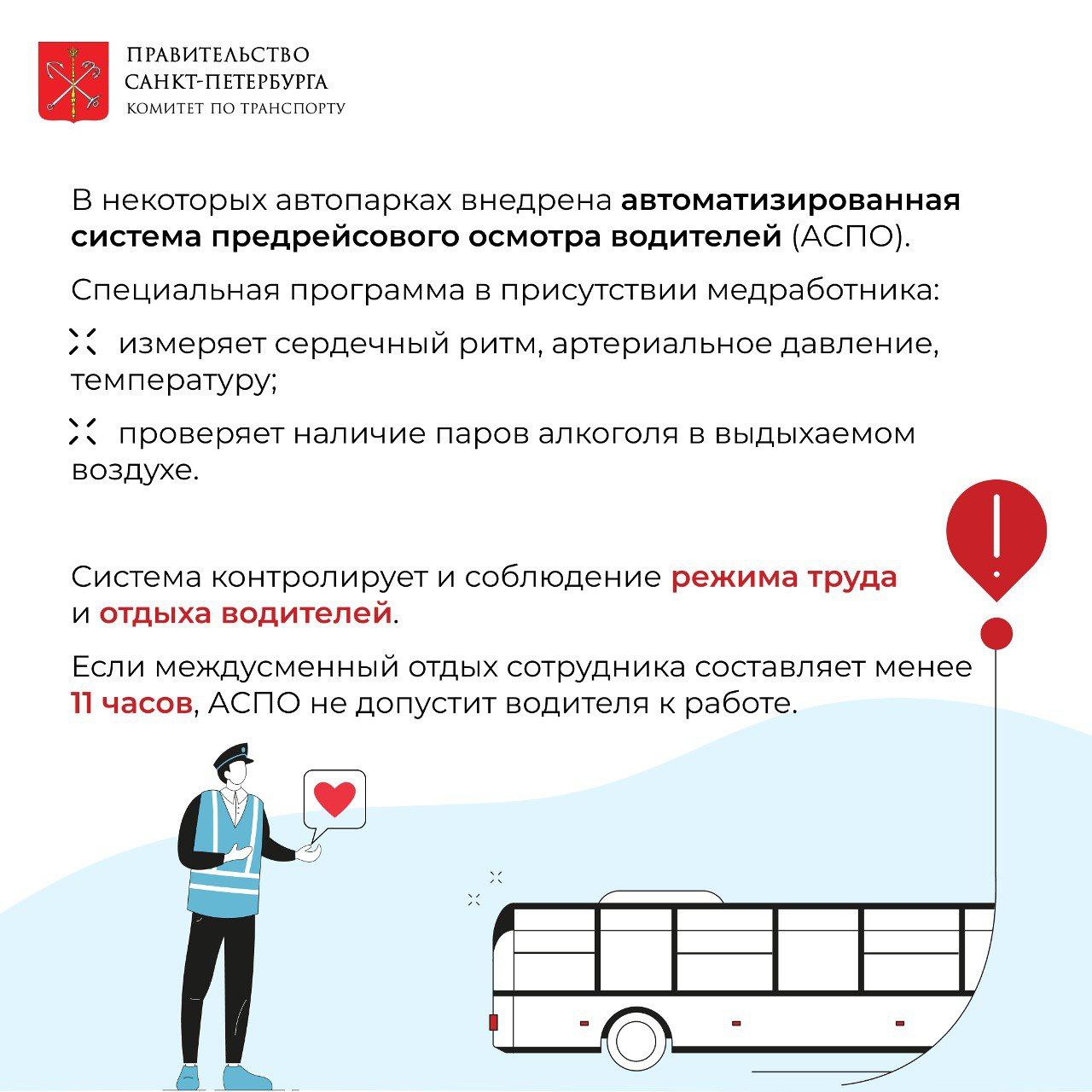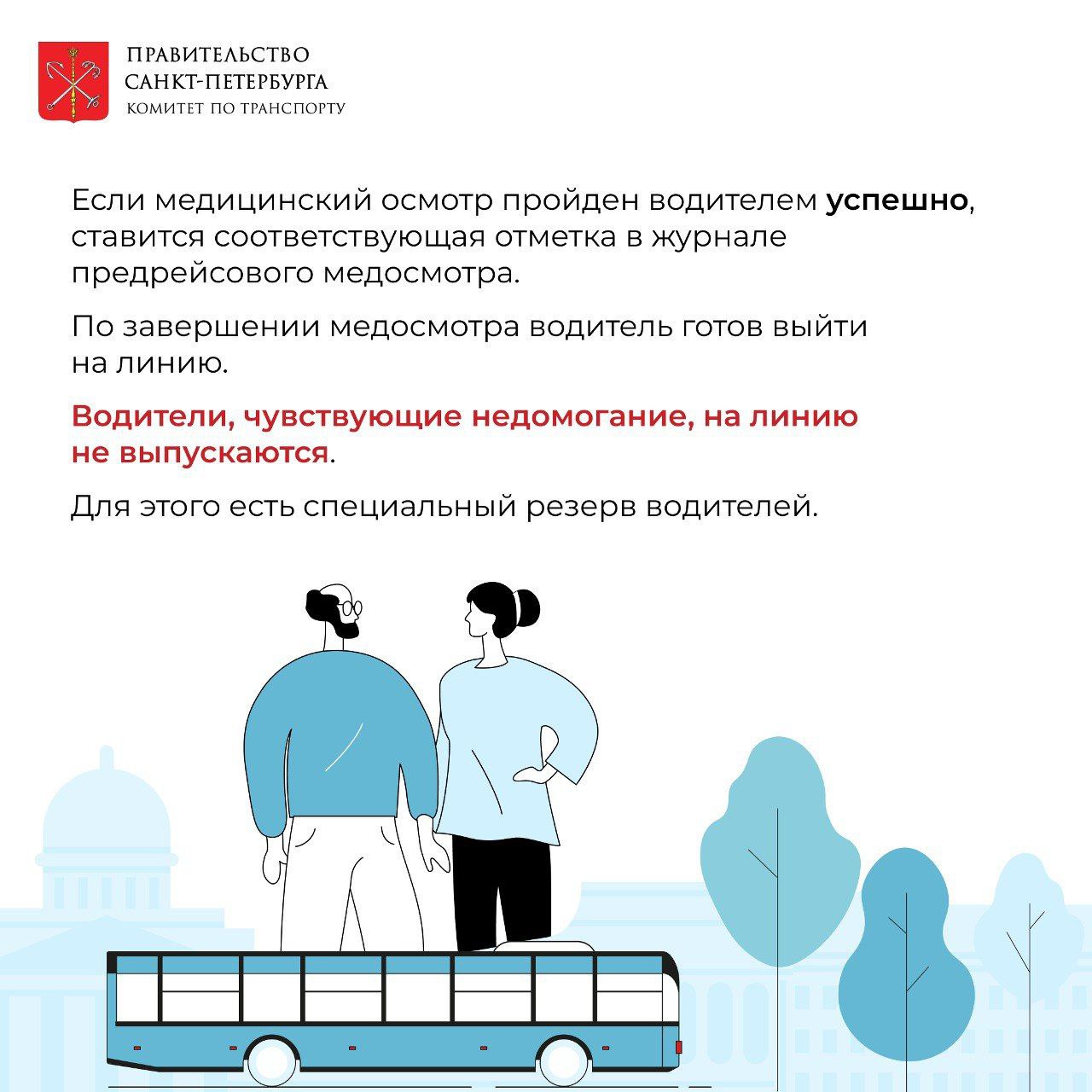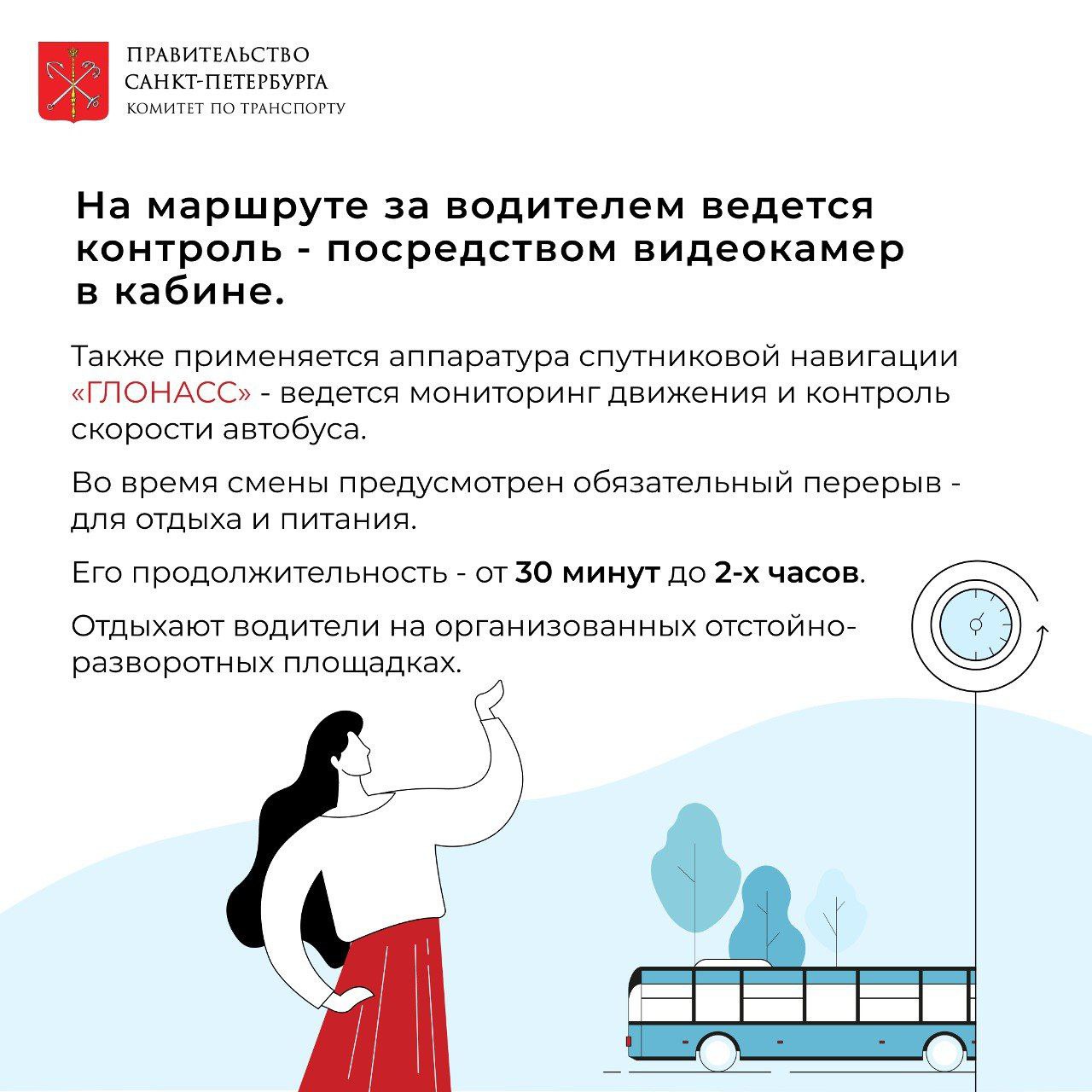 Весь водительский состав для работы на маршрутах общественного транспорта в Петербурге принимается перевозчиками в строгом соответствии с трудовым законодательством России. Каждый водитель наземного транспорта имеет водительские права необходимой категории, в частности водители автобуса - права категории «Д». Кроме того, каждый сотрудник независимо от стажа вождения и работы водителем проходит обязательную трехступенчатую подготовку. Она включает в себя теоретическую и практическую части, а также стажировку на линии - с пассажирами и без них. По результатам прохождения всех этапов подготовки каждый водитель сдает обязательный зачет.