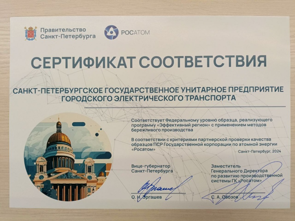 Сегодня состоялось вручение сертификатов соответствия исполнительным органам государственной власти и подведомственным организациям, которые подтвердили статус «Образец федерального уровня» по внедрению бережливых технологий программы «Эффективный регион». В числе лучших - СПб ГУП «Горэлектротранс». Церемония прошла в рамках круглого стола по обмену опытом успешно реализованных проектов, организованного Комитетом по промышленной политике, инновациям и торговле Санкт‑Петербурга совместно с СПб ГУП «Санкт‑Петербургский информационно-аналитический центр» и ГК «Росатом».
