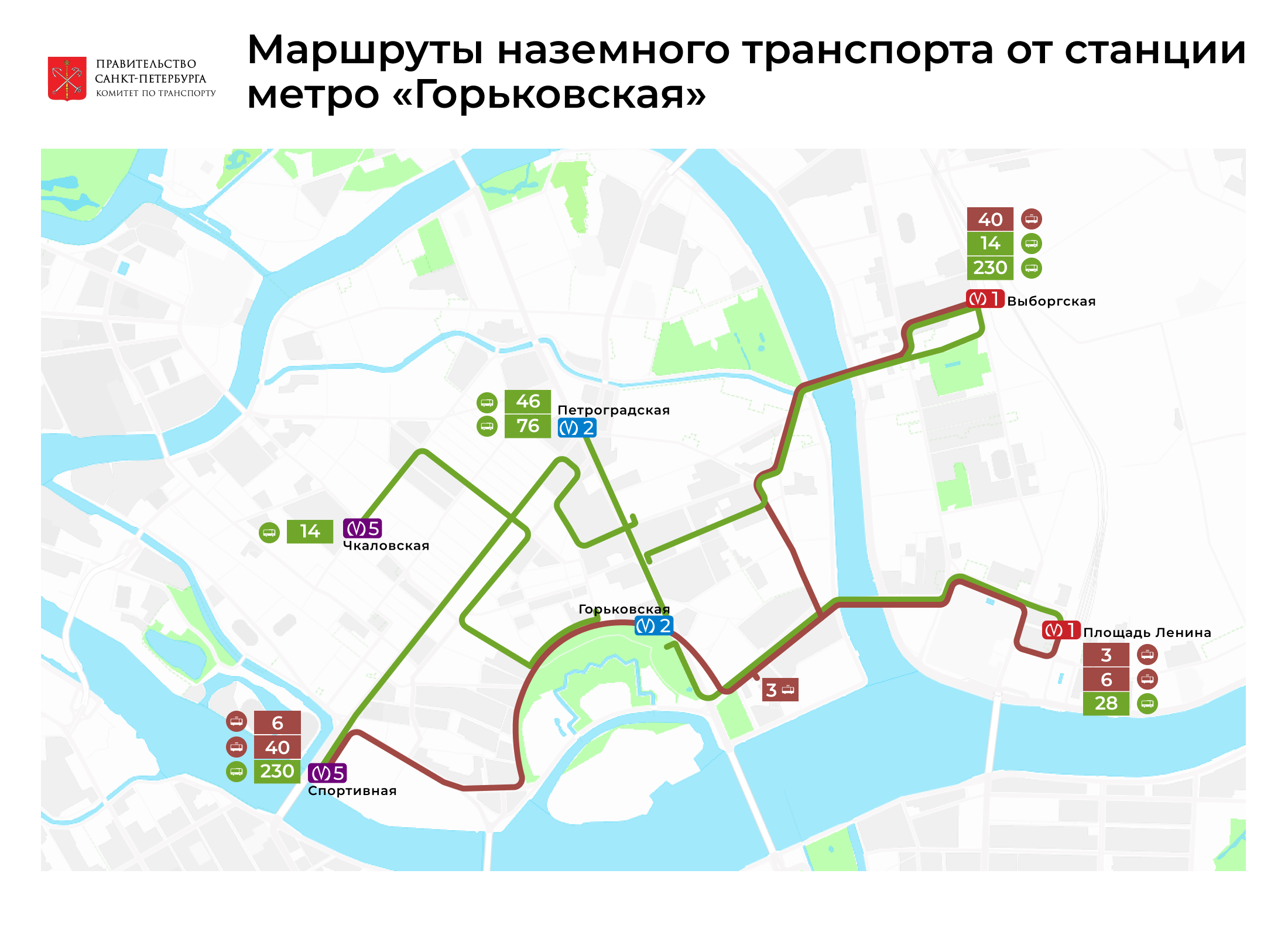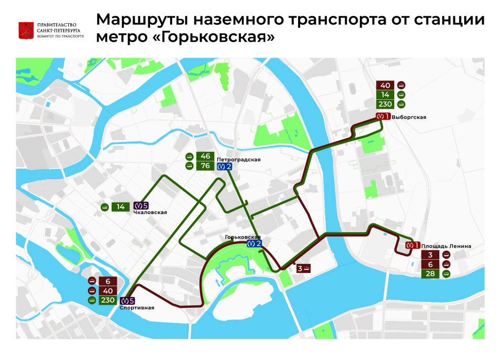 От станции «Горьковская» можно доехать наземным транспортом до ближайших станций метро: