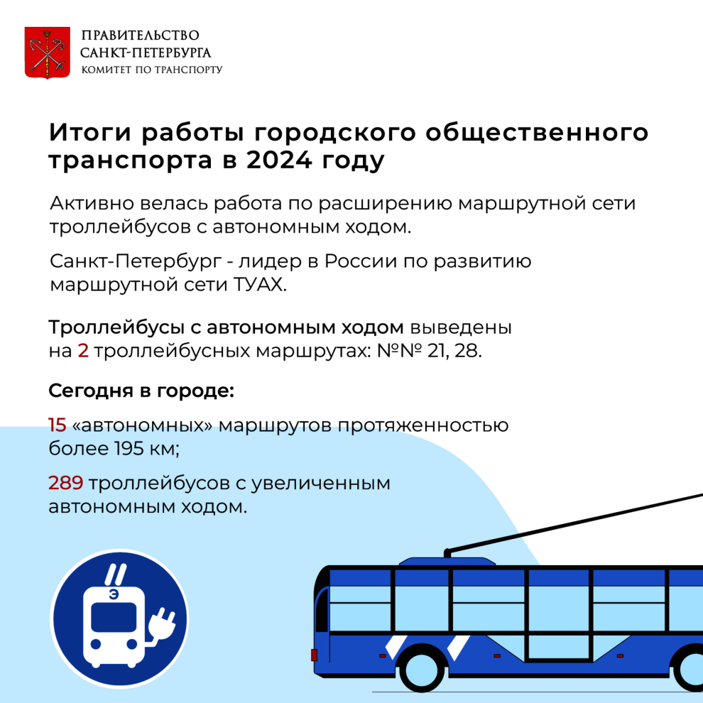 Санкт‑Петербург - лидер в России по развитию маршрутной сети троллейбусов с увеличенным автономным ходом. Сегодня в городе уже 15 «автономных» маршрутов протяженностью более 195 км, на которых эксплуатируется 289 троллейбусов с увеличенным автономным ходом.