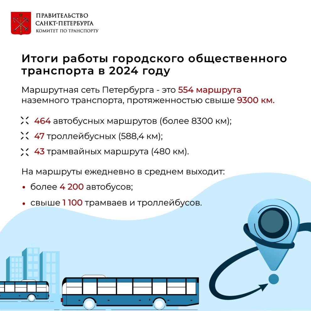 Всего в 2024 году во всех районах Петербурга внесено более 2650 изменений в маршруты регулярных пассажирских перевозок: изменение трасс следования, расписаний движения, ввод новых остановочных пунктов).