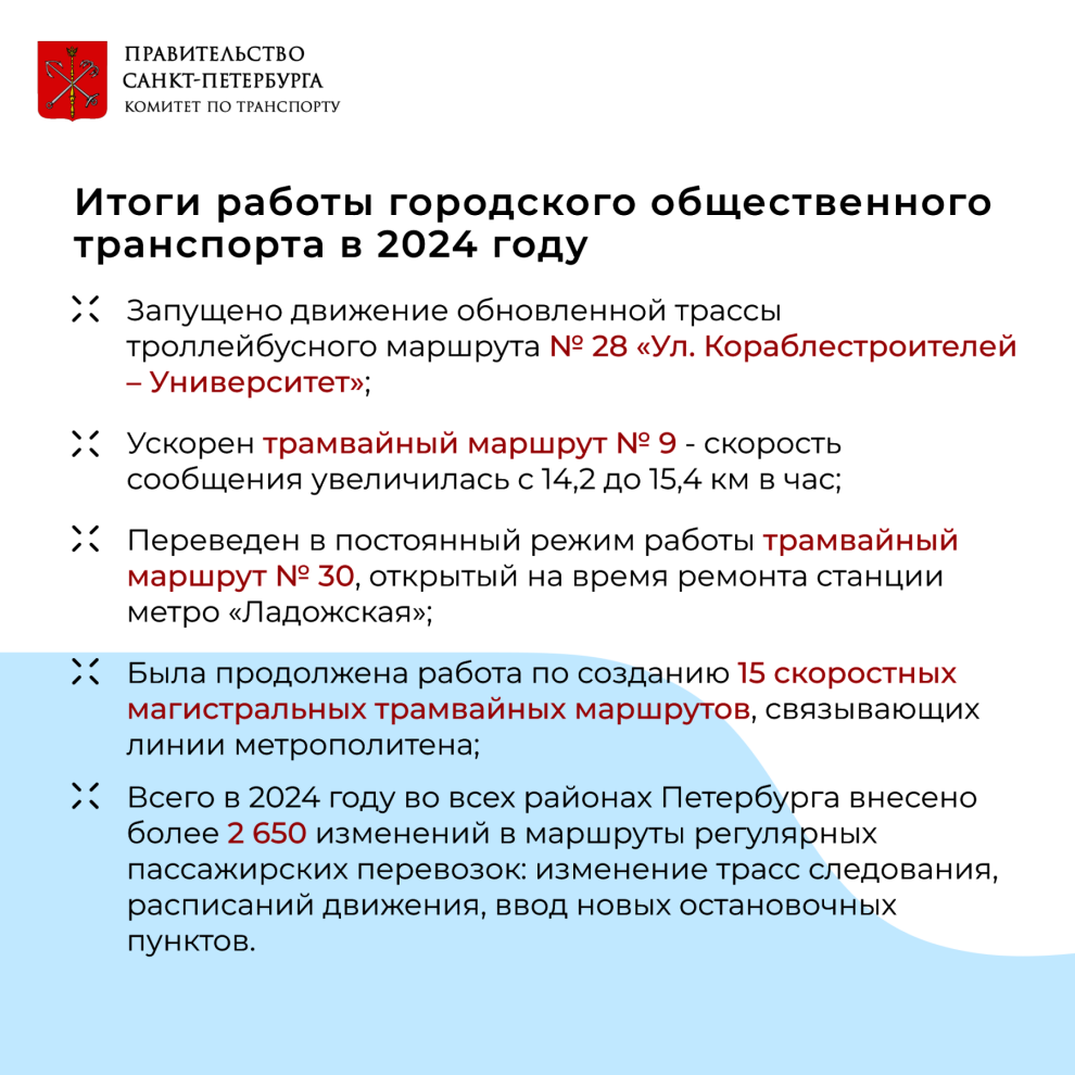 В 2024 году было запущено движение обновленной трассы троллейбусного маршрута № 28 «Ул. Кораблестроителей – Университет», ускорен трамвайный маршрут № 9 - время пробега по маршруту уменьшилось на 5 минут, скорость сообщения увеличилась с 14,2 до 15,4 км в час, а также переведен в постоянный режим работы трамвайный маршрут № 30, открытый на время ремонта станции метро «Ладожская».