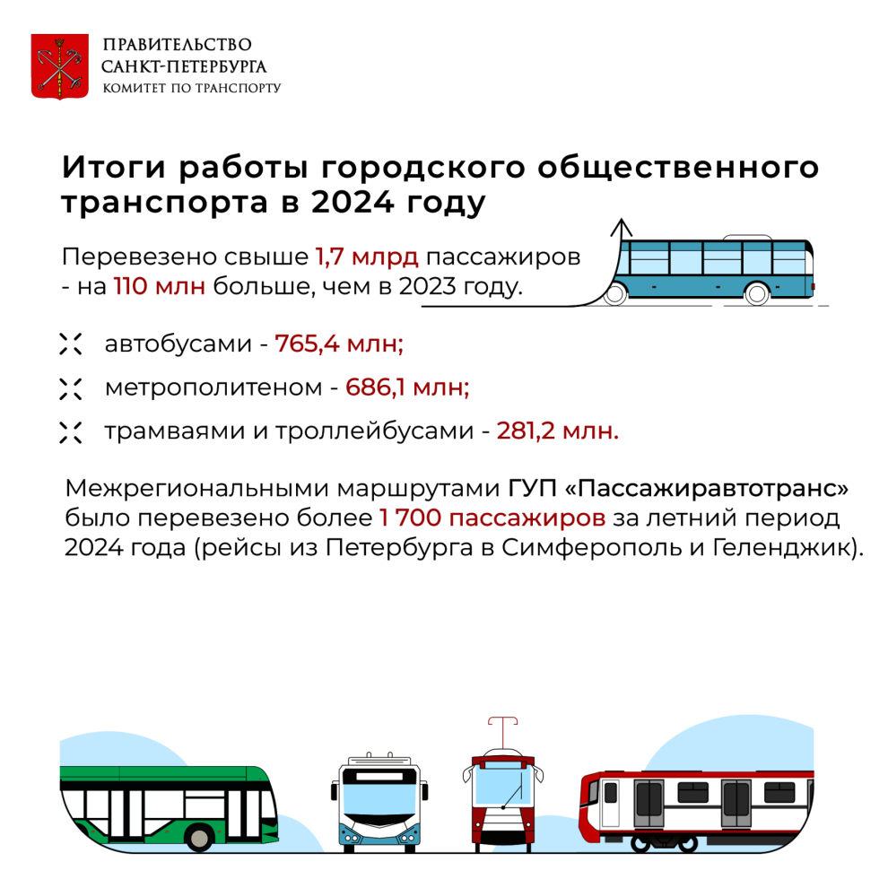 За прошедший год городским общественным транспортом Петербурга воспользовались более 1,7 млрд человек – это на 110 млн больше, чем в 2023 году.