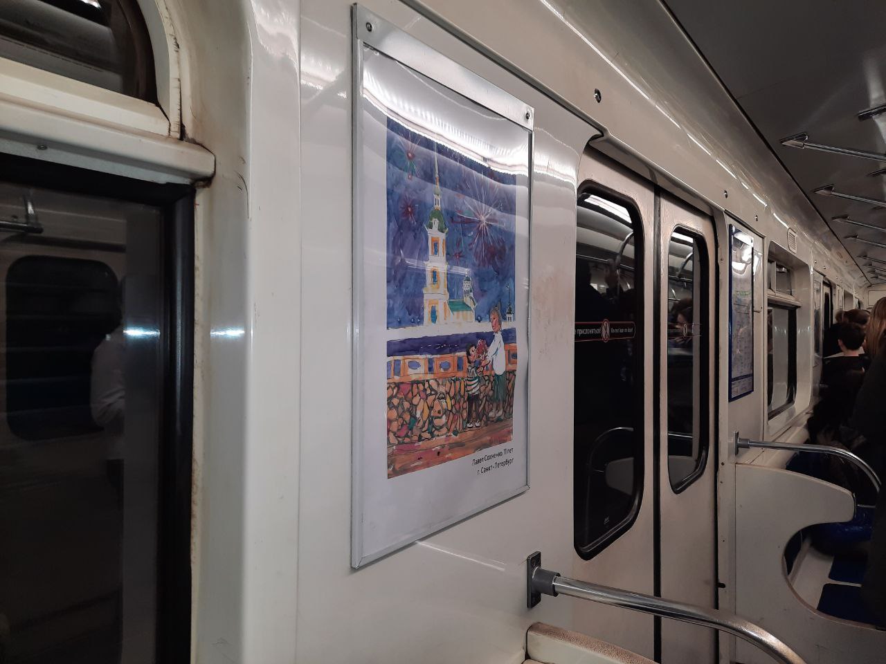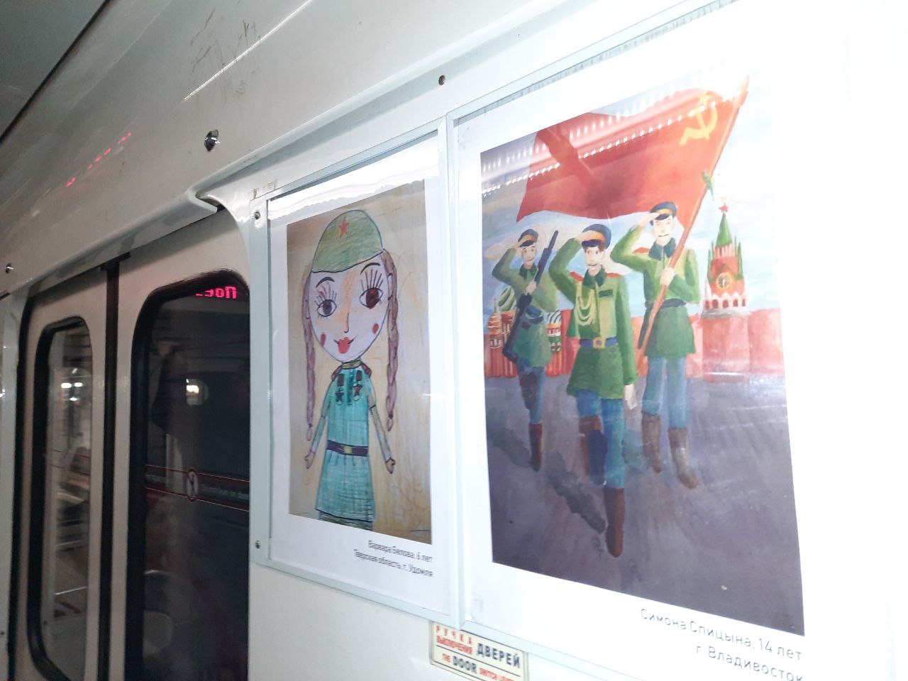 Электропоезд оформлен и внешне, и внутренне. На стенах вагонов размещены рисунки, объединенные общей темой «Радость Победы». Всего порядка 30 работ учащихся художественных школ не только из Северной столицы, но и многих других уголков нашей страны: от Кургана до Владивостока, от Нижнего Новгорода до Сыктывкара.