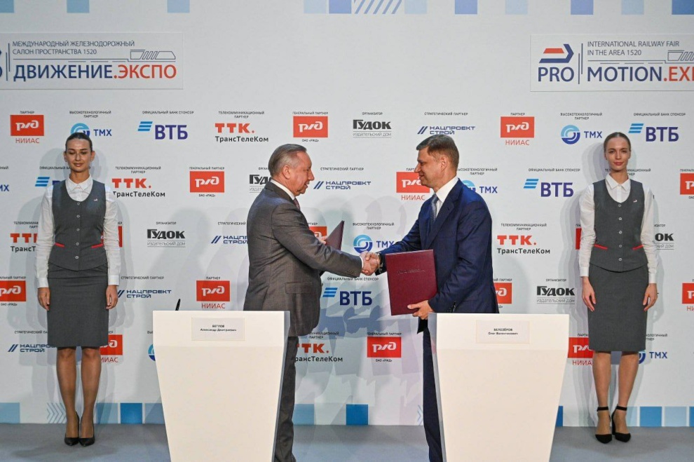 Второй день работы Международного железнодорожного салона техники и технологий «PRO//Движение.Экспо» ознаменован значимым событием для развития транспортной отрасли Северной столицы. В Музее железных дорог России состоялась церемония подписания Соглашения о взаимодействии и сотрудничестве между Санкт‑Петербургом и ОАО «Российские железные дороги» на период 2025 – 2030 годов. Документ подписали Губернатор Санкт‑Петербурга Александр Беглов и Генеральный директор – председатель правления ОАО «РЖД» Олег Белозеров.