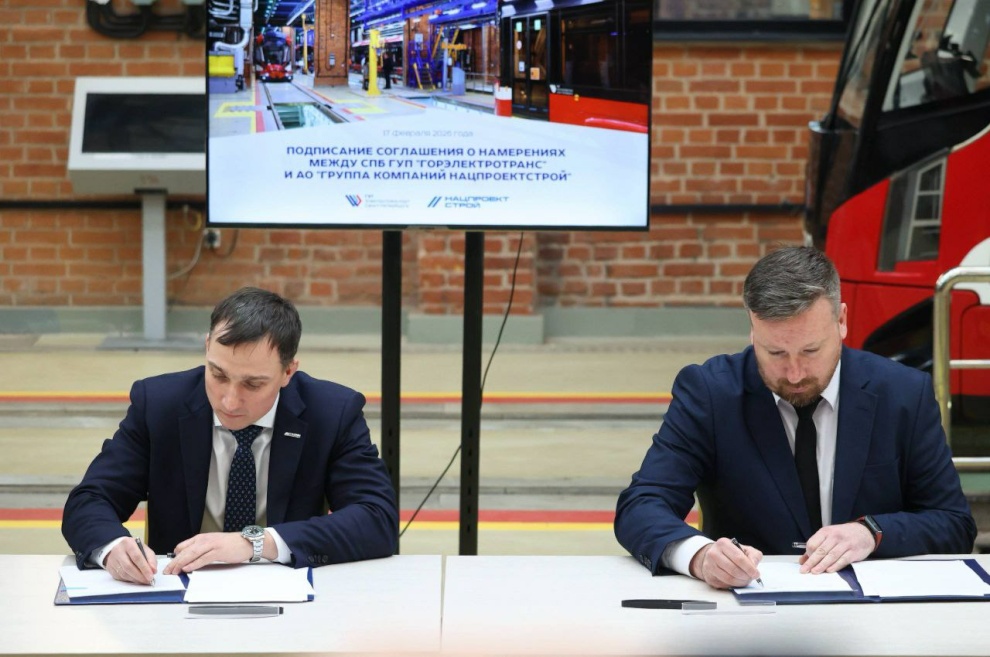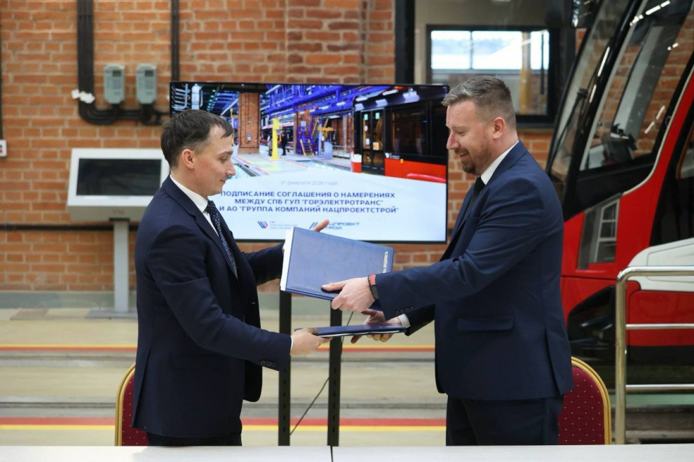 В Трамвайном парке №7 сегодня подписано соглашение о сотрудничестве в данном направлении. Свои подписи под документом поставили временно исполняющий обязанности директора СПб ГУП «Горэлектротранс» Константин Шостак и заместитель генерального директора АО «Группа компаний Нацпроектстрой» по коммерции Дмитрий Болотский.