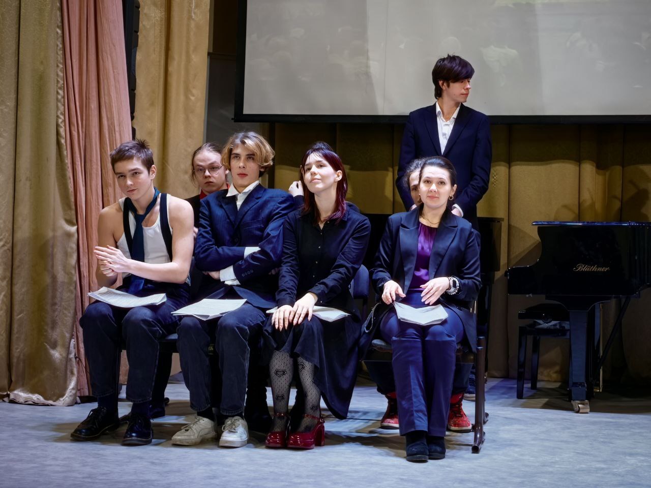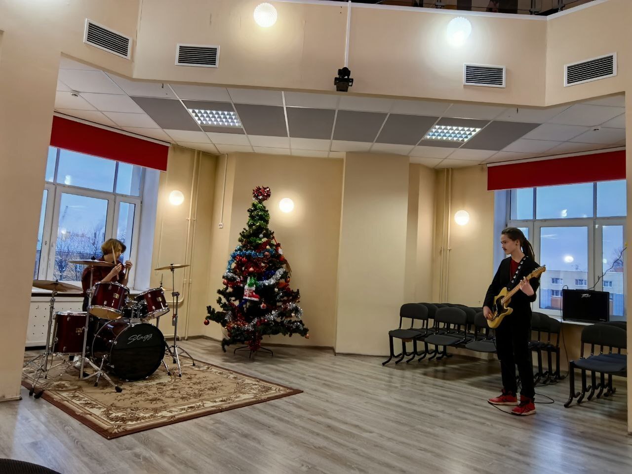 Пространство вдохнуло новую жизнь в актовый зал школы и помещения, расположенные за ним, где, по задумке старшеклассников, реализовались их мечты о работе с музыкой и театром на профессиональном уровне. Ребята закупили полный набор музыкальных инструментов, пульт, звуковую карту и PTZ-камеру для проведения и трансляции живых встреч и неформальных музыкальных концертов, профессиональное световое оборудование для сопровождения театральных представлений, а за самим актовым залом были созданы музыкально-театральные мастерские: уютная гримёрка с зеркалами с подсветкой, реквизиторская с незаменимой героиней спектаклей и концертов дым-машиной по имени Люся, а также небольшой швейный цех для изготовления костюмов. Ребята признались, что долгие месяцы в ожидании открытия они изучали и тестировали каждую поставку оборудования, а в целях экономии средств даже сделали косметический ремонт вместе с куратором в ⅔ помещений, к которому в том числе привлекли и ребят из других классов.