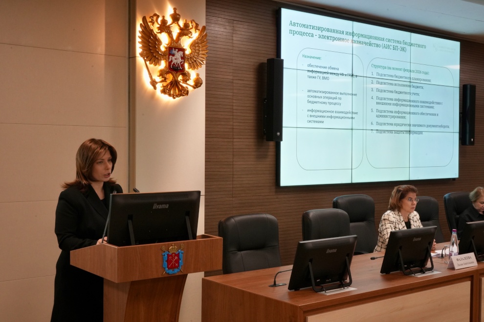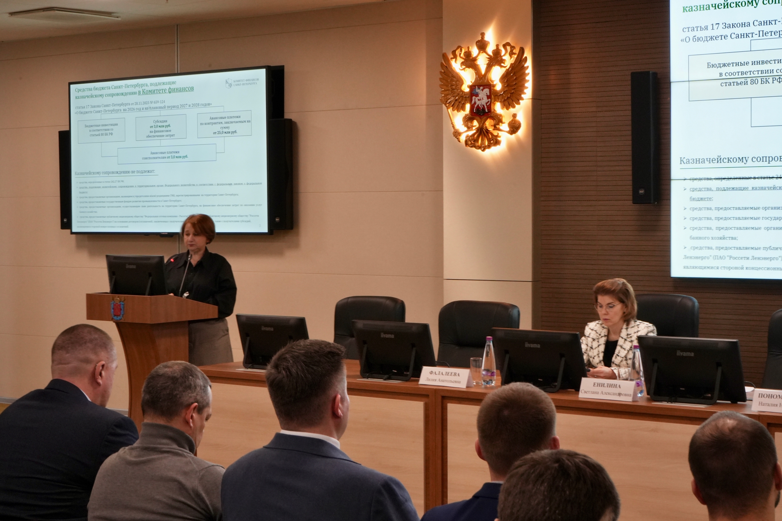 Наталия Пономаренко рассказала о механизмах казначейского сопровождения и контроля целевых средств бюджета Санкт‑Петербурга. С 2026 года расширен перечень средств, подлежащих сопровождению: субсидии на финансовое обеспечение затрат и авансовые платежи соисполнителям — от 3 млн рублей, авансы по контрактам — от 25 млн рублей.