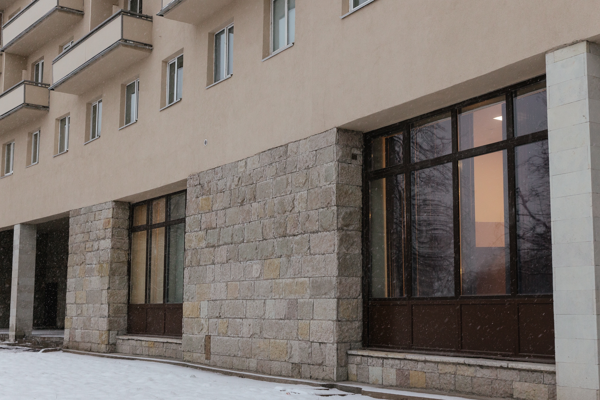 Особое внимание было уделено работе с натуральным камнем: широко применялся известняк «рваной фактуры», отреставрированы колонны из полированного камня, выполнена тонкая работа с проходными арками. Отдельным направлением стал ремонт 387 балконов с ограждениями из асбестоцементных плит и обновление дворового фасада, облицованного кирпичом.
