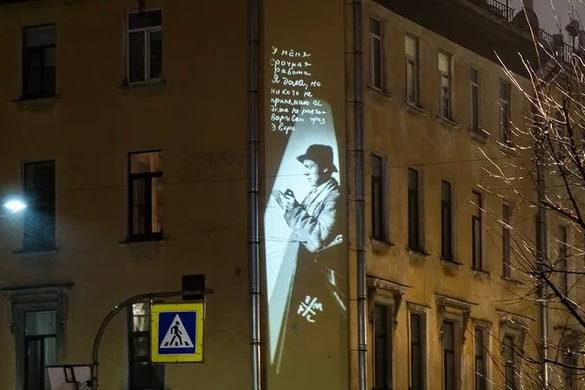 К юбилею со дня рождения Даниила Хармса новая световая проекция украсила дом №11А на улице Маяковского, где писатель прожил 16 лет. На проекции изображен молодой Даниил Хармс, делающий пометки в записной книжке, а подпись гласит: «У меня срочная работа. Я дома, но никого не принимаю. И даже не разговариваю через дверь».