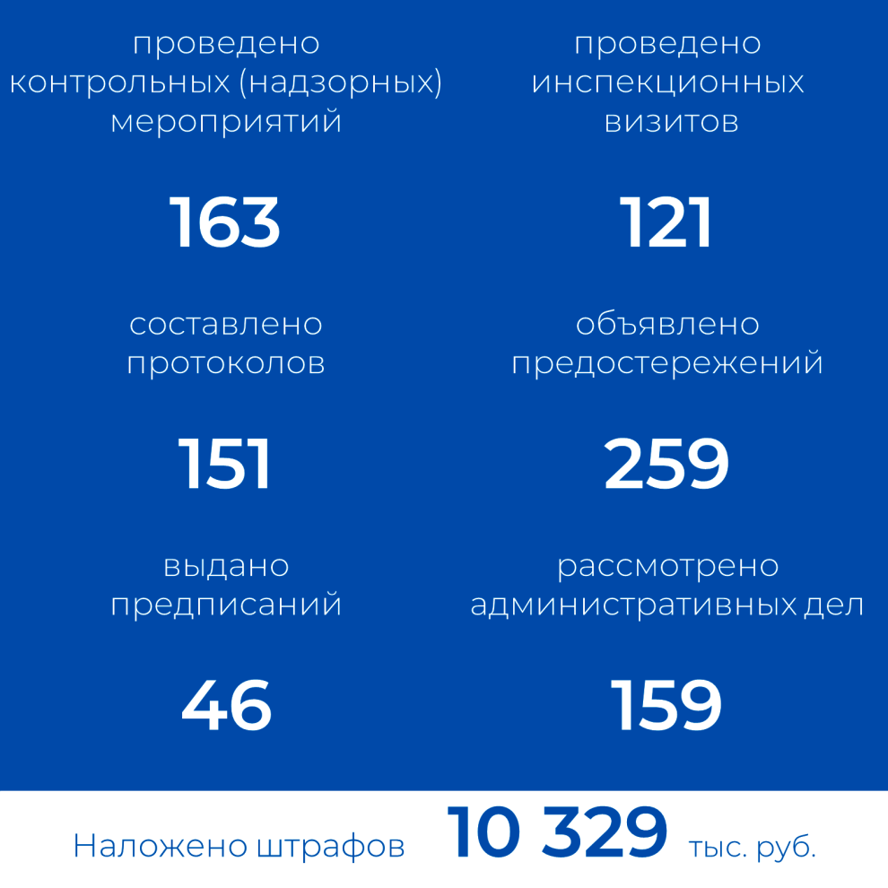Кроме того, за отчётный период по результатам рассмотрения дел об административных правонарушениях вынесены постановления о привлечении виновных лиц к административной ответственности на сумму 10 329 тысяч рублей в соответствии с законодательством об административных правонарушениях.