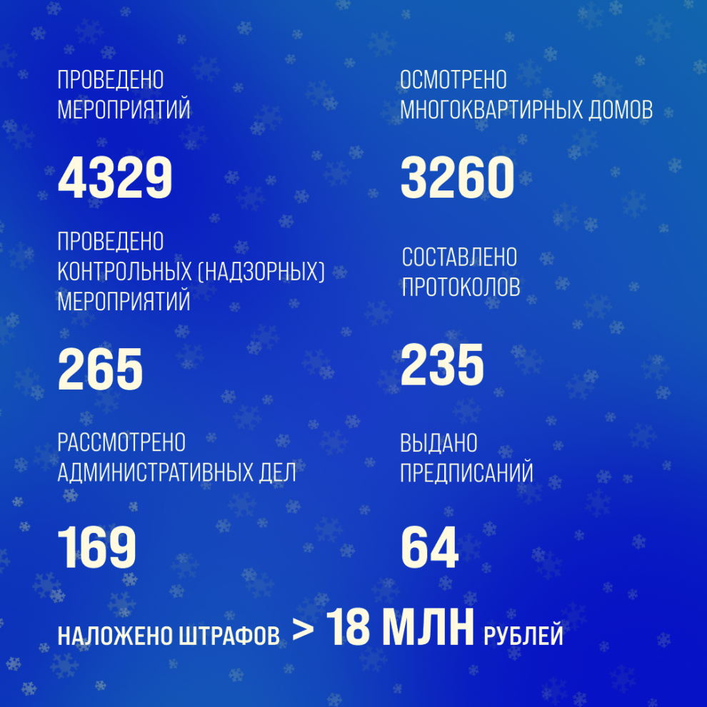 По итогам контрольных мероприятий инспекторы составили 235 протоколов об административных правонарушениях и выдали 64 предписания на устранение нарушений жилищного законодательства. Помимо этого, в качестве превентивной меры управляющим организациям объявлено 298 предостережений о недопустимости нарушения обязательных требований.