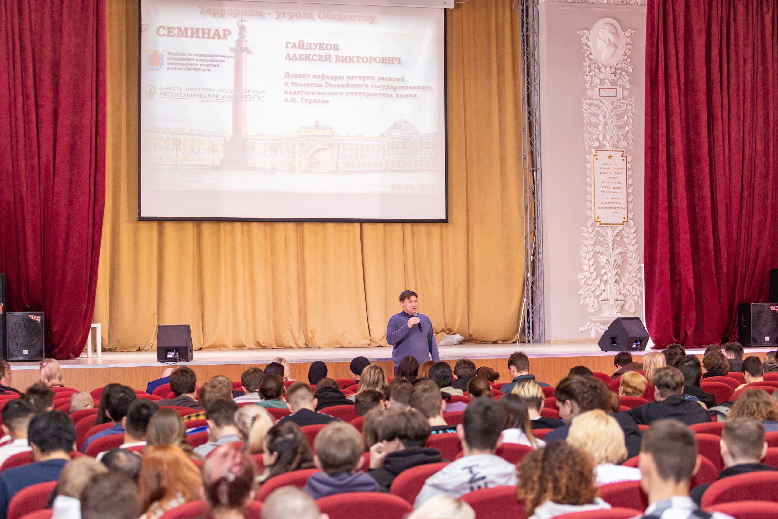 Комитет по межнациональным отношениям и реализации миграционной политики Санкт‑Петербурга организовал семинар «Терроризм – угроза обществу» на базе Санкт‑Петербургского государственного лесотехнического университета имени С.М. Кирова. Мероприятие было направлено на профилактику идеологии терроризма и экстремистских проявлений среди иностранных студентов, а также на укрепление межнационального согласия и правовой грамотности.