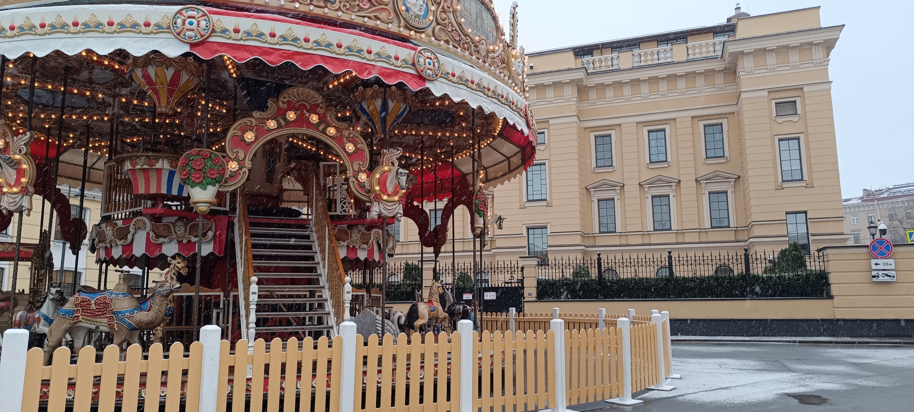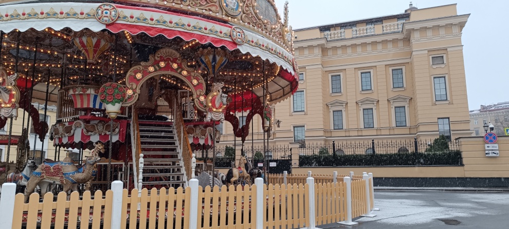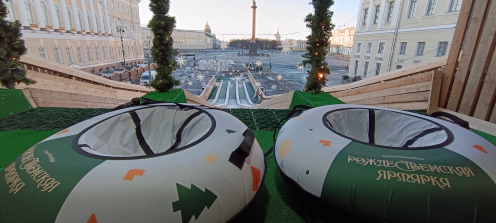 На Дворцовой площади традиционно установлена «Рождественская горка». Аттракцион был изготовлен в 2022 году в России и представляет собой четыре спуска и трассу для подъема тюбингов, более известных как «ватрушки». Горка имитирует настоящий 63-метровый ледяной склон, но благодаря специальному щеточному покрытию может использоваться даже при плюсовой температуре — до +30 градусов. Общая высота аттракциона составляет 9 метров, а высота стартового участка, с которого начинается спуск на тюбингах,— 6 метров. Это позволяет отнести горку к категории RB-2 — средней величине биомеханического воздействия, как это определено техническим регламентом Евразийского экономического союза «О безопасности аттракционов».