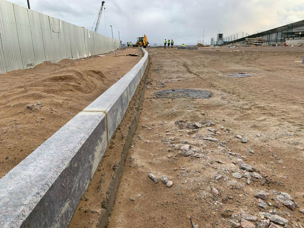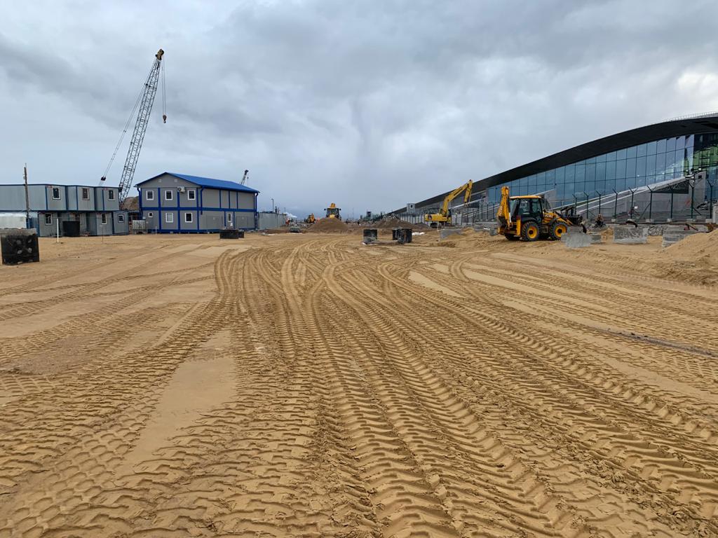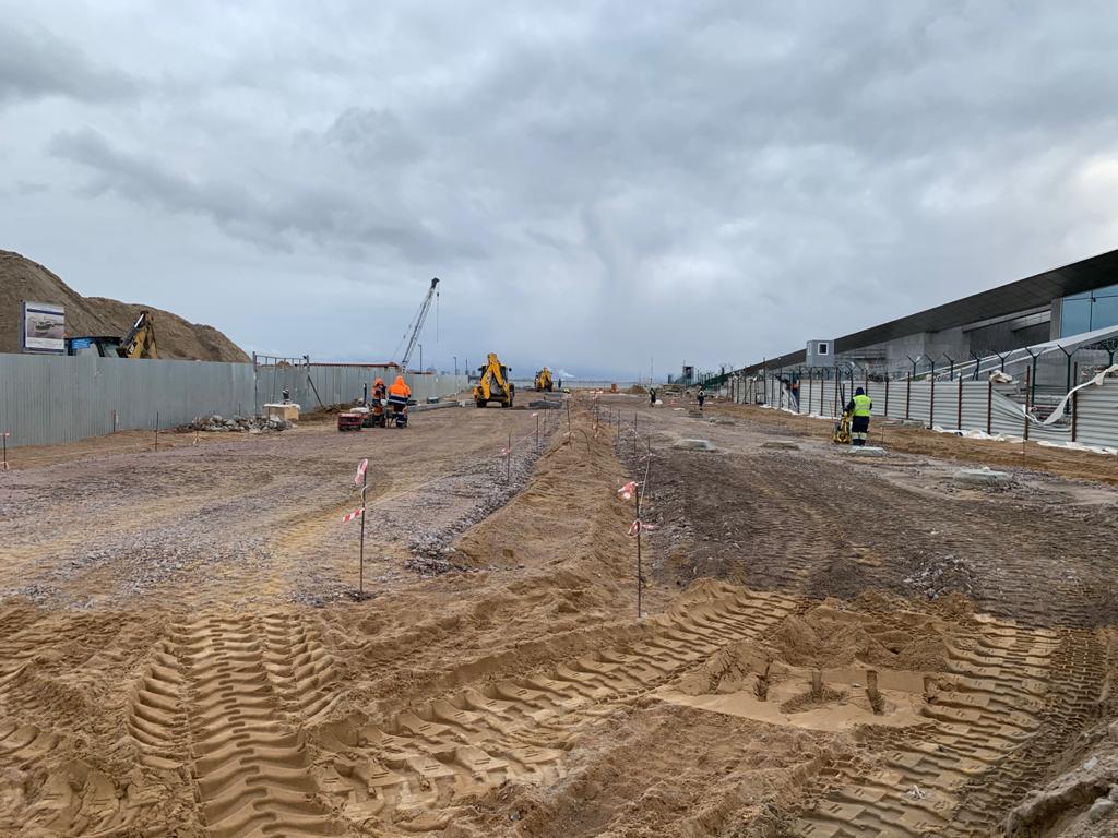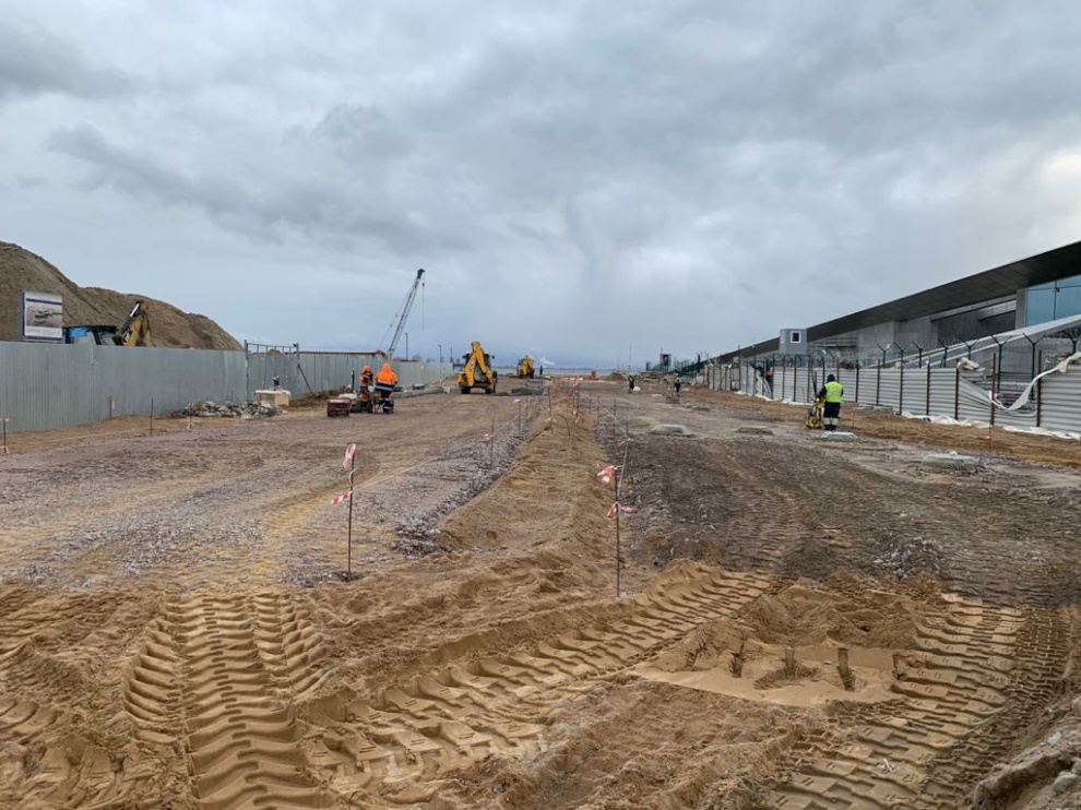 В рамках строительства Воздушной ул. ведутся работы по устройству песчаного и щебеночного основания, установке гранитного бортового камня, монтажу фундаментов под рамные опоры и светофоры, прокладке трубных канализаций для слаботочных кабелей и кабелей электроснабжения. Далее генподрядчик планирует начать работы по укладке первого асфальтобетонного покрытия.