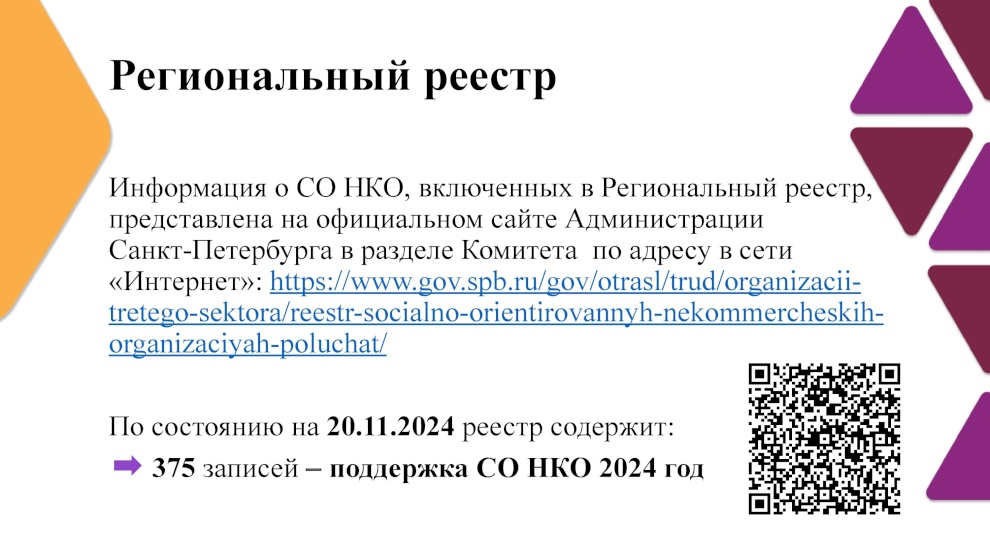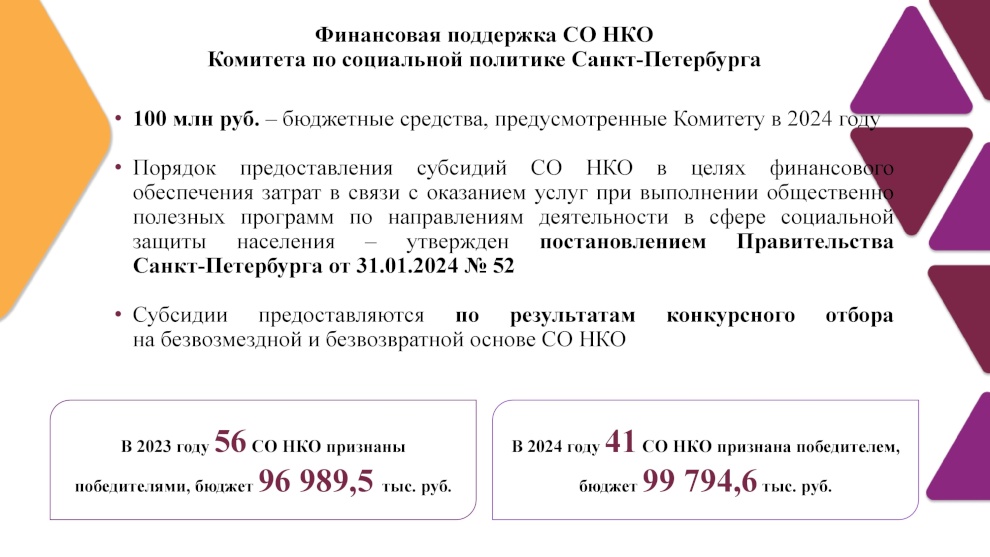 Заместитель председателя Комитета по социальной политике Санкт‑Петербурга Александр Любимов рассказал, что в Санкт‑Петербурге зарегистрировано более 9 тысяч некоммерческих организаций, из них 3,6 - социально ориентированные. «Деятельность некоммерческих организаций в Санкт‑Петербурге уже более 30 лет активно поддерживается органами государственной власти, в том числе в форме финансовой поддержки в виде предоставления субсидий и грантов на реализацию общественно полезных программ на конкурсной основе. Общий размер финансовой поддержки из бюджета Санкт‑Петербурга в 2023 году составил 3,7 млрд рублей, в 2024 году - более 4 млрд рублей», - отметил он.