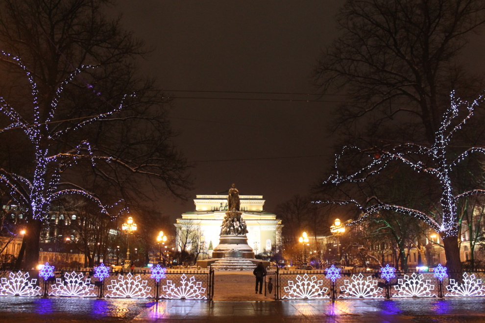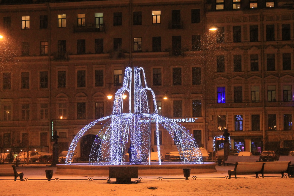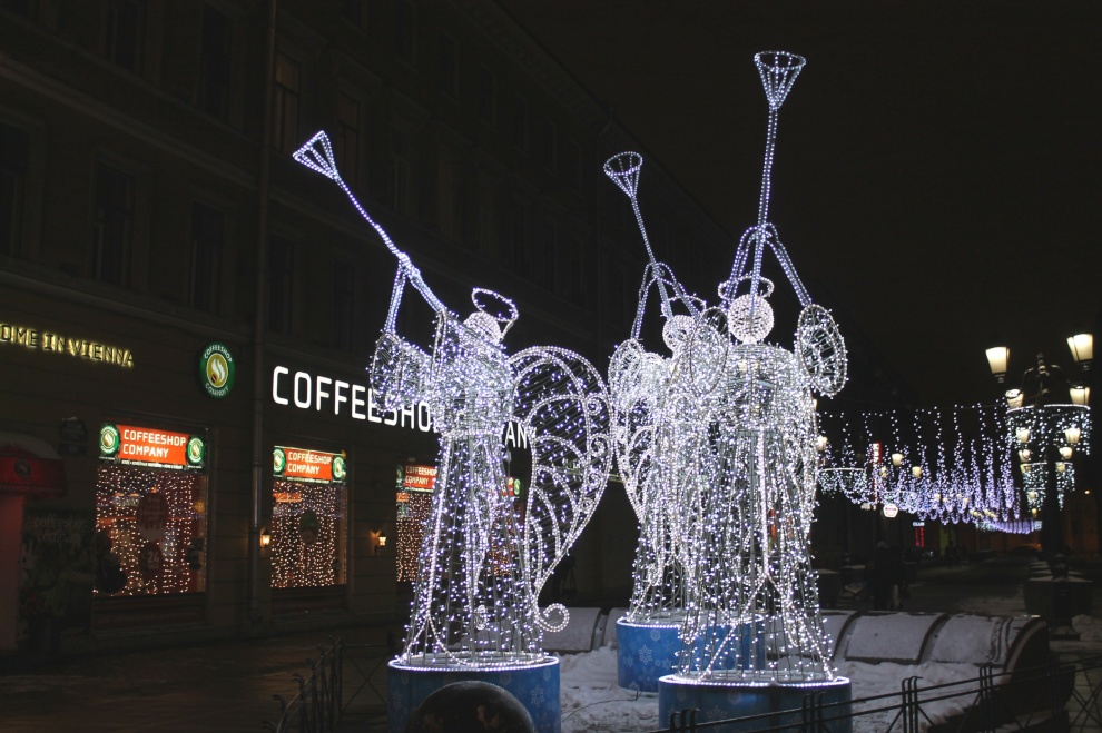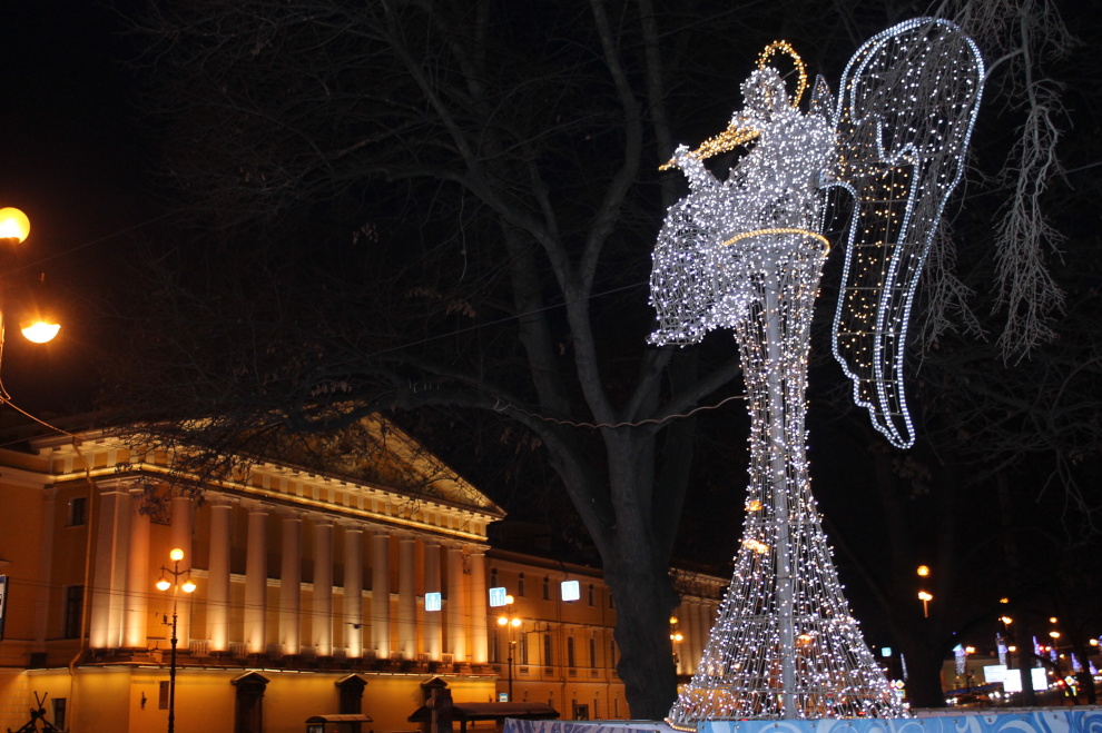 Площадь Александра Невского. На ограду Александро-Невской Лавры помещена композицию «Ангел», слева на газоне размещена композиция «Снег», в центре площади возвышается празднично украшенная ель.