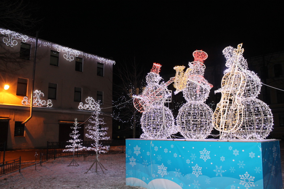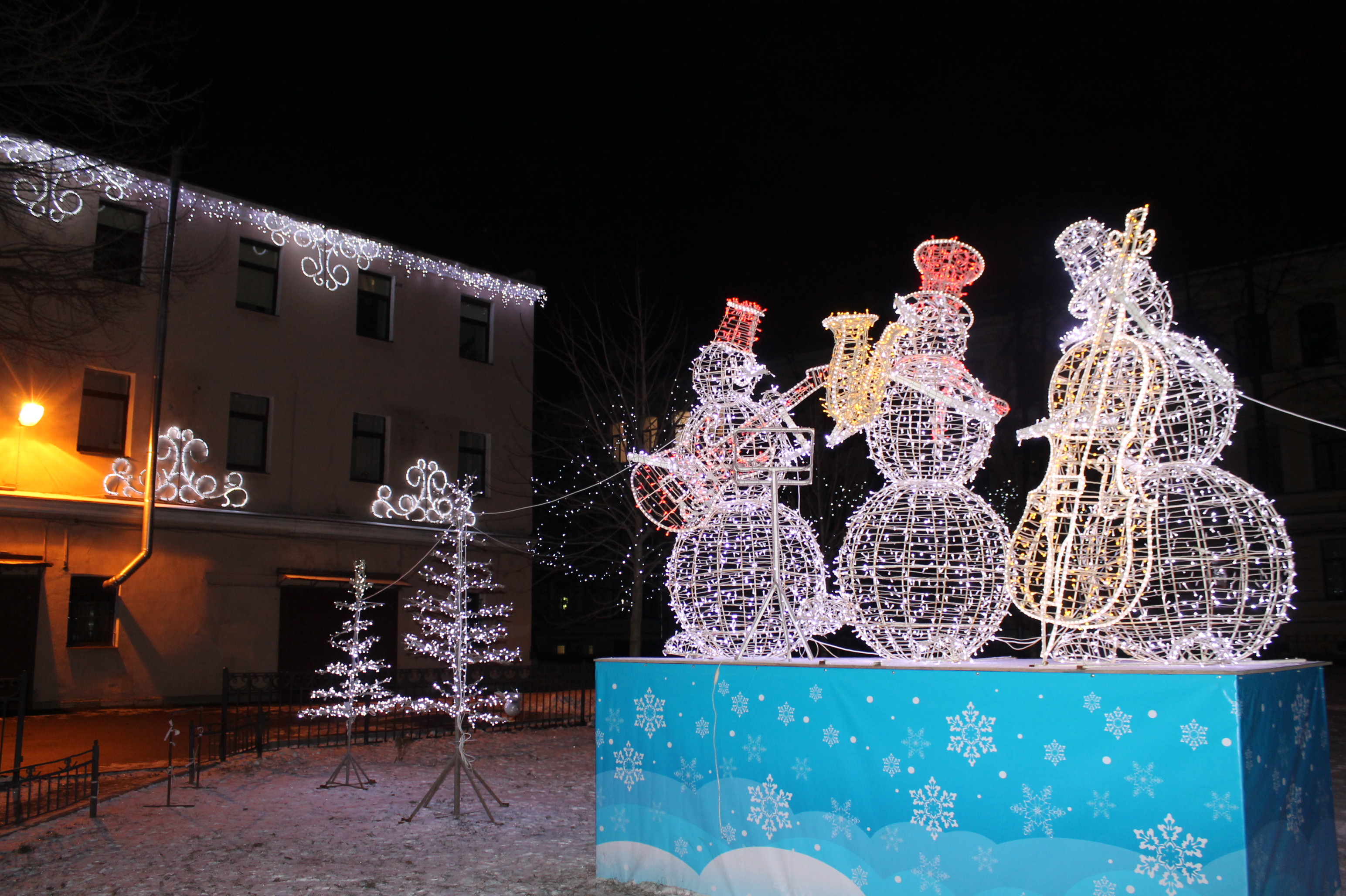 Во дворе Исполкомовской ул., д.1 на подиуме размещена светодиодная композиция «Трио снеговиков», установлено 5 световых «елей», украшенных прозрачными шарами с мишурой. Светодиодными гирляндами украшено 5 деревьев, фасад здания оформлен световыми элементами на металлокаркасе из гирлянд дюралайт и «Бахрома».