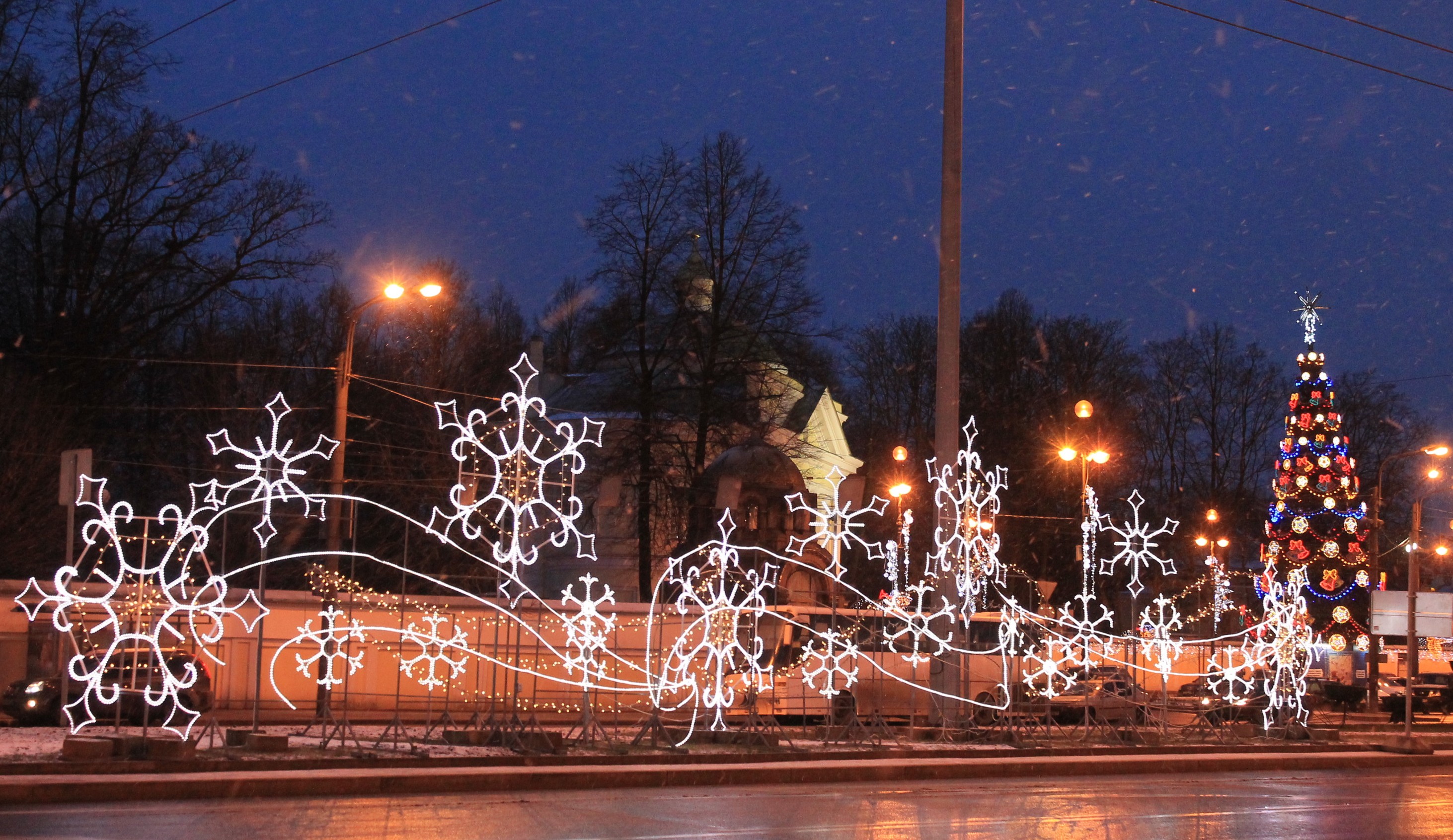 На пл. Островского решетка ограды Екатерининского сквера украшена светодиодными элементами «Подснежники» и «Снежинка ажурная». Гирляндами украшено 4 дерева.