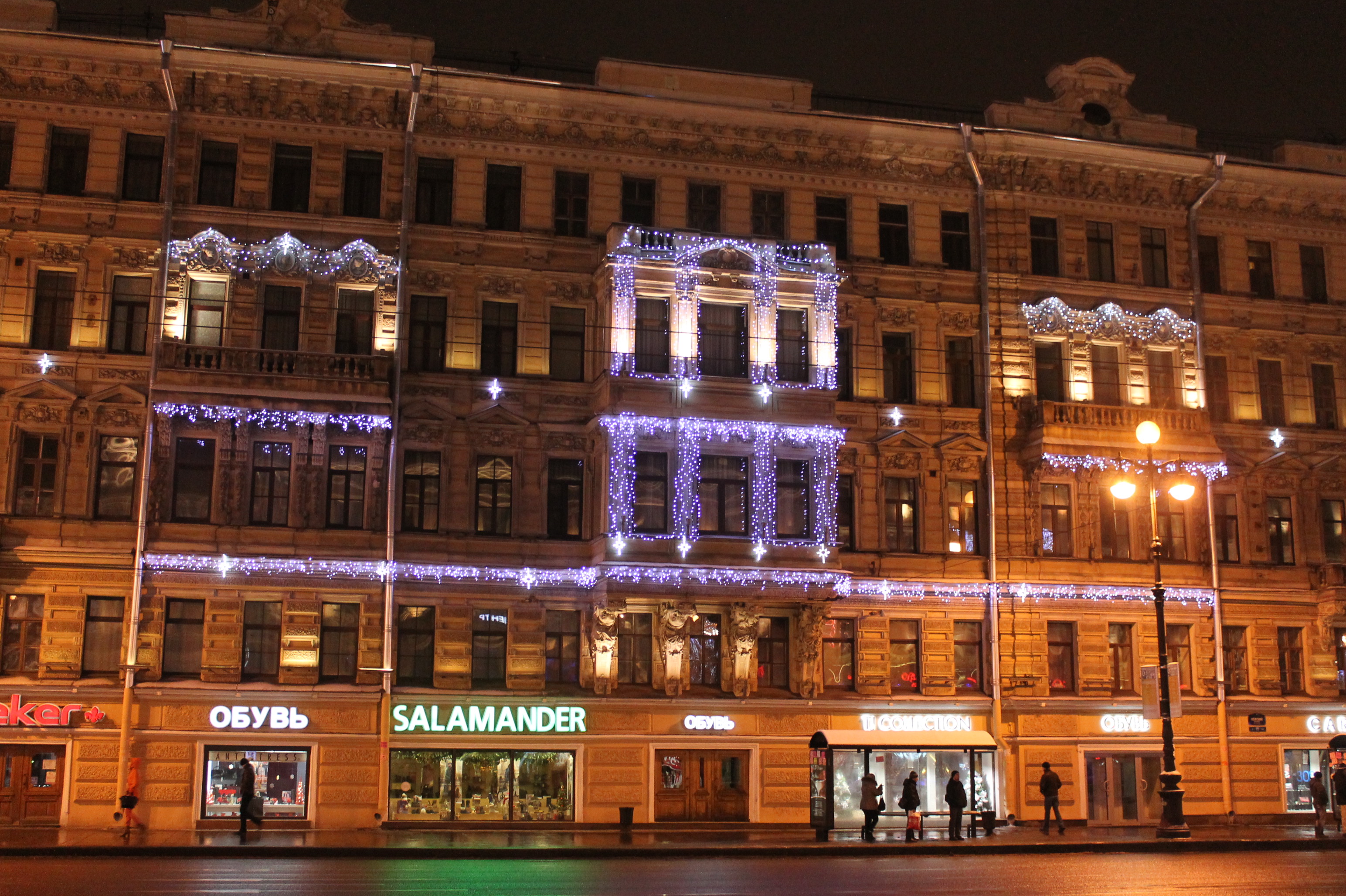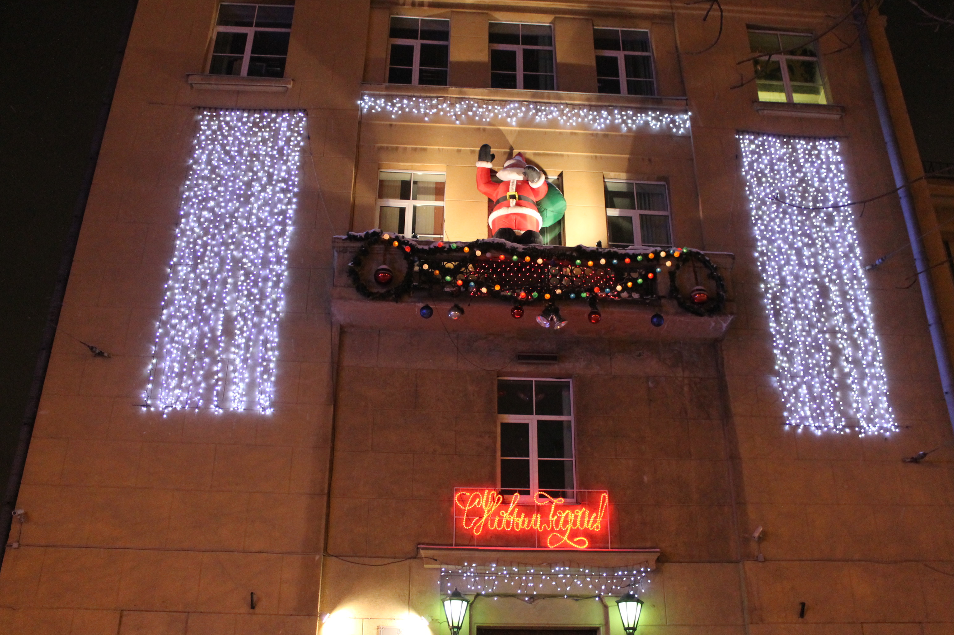 Невский пр., д.77 украшен светодиодными гирляндами «Дождь». Бахромой теплого белого цвета и звездами «Сириус» оформлено 4 балкона.