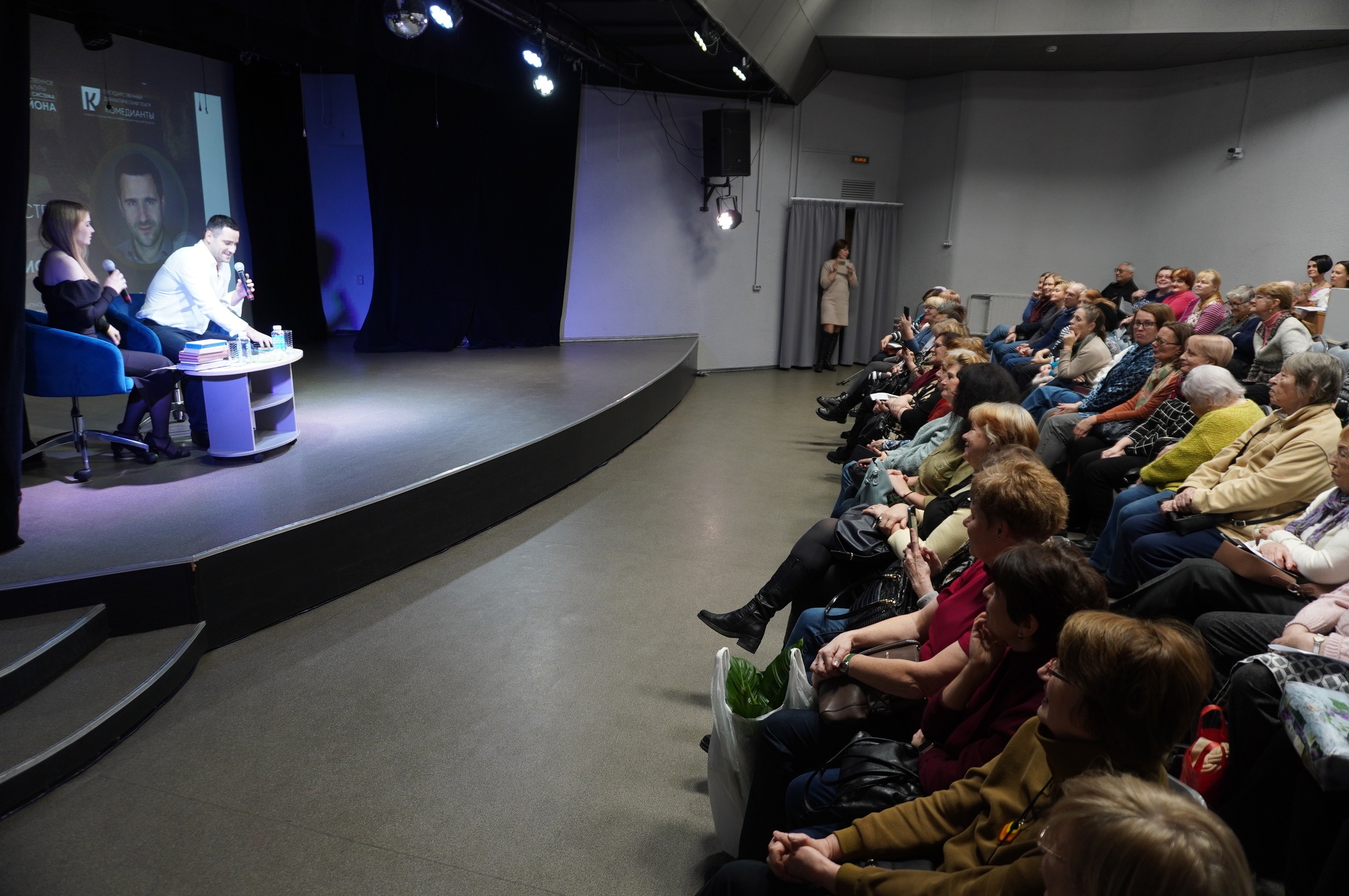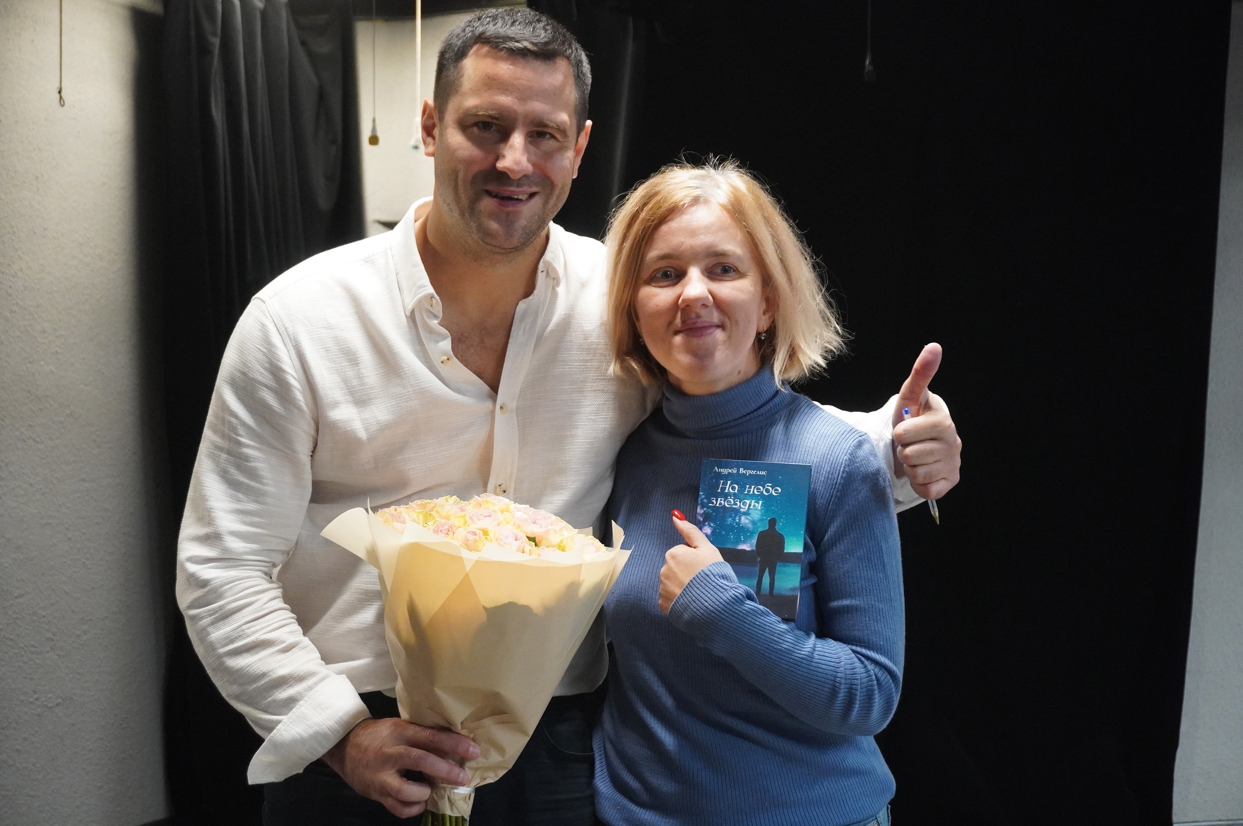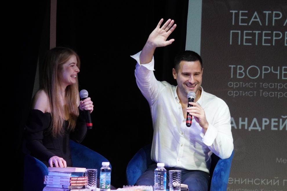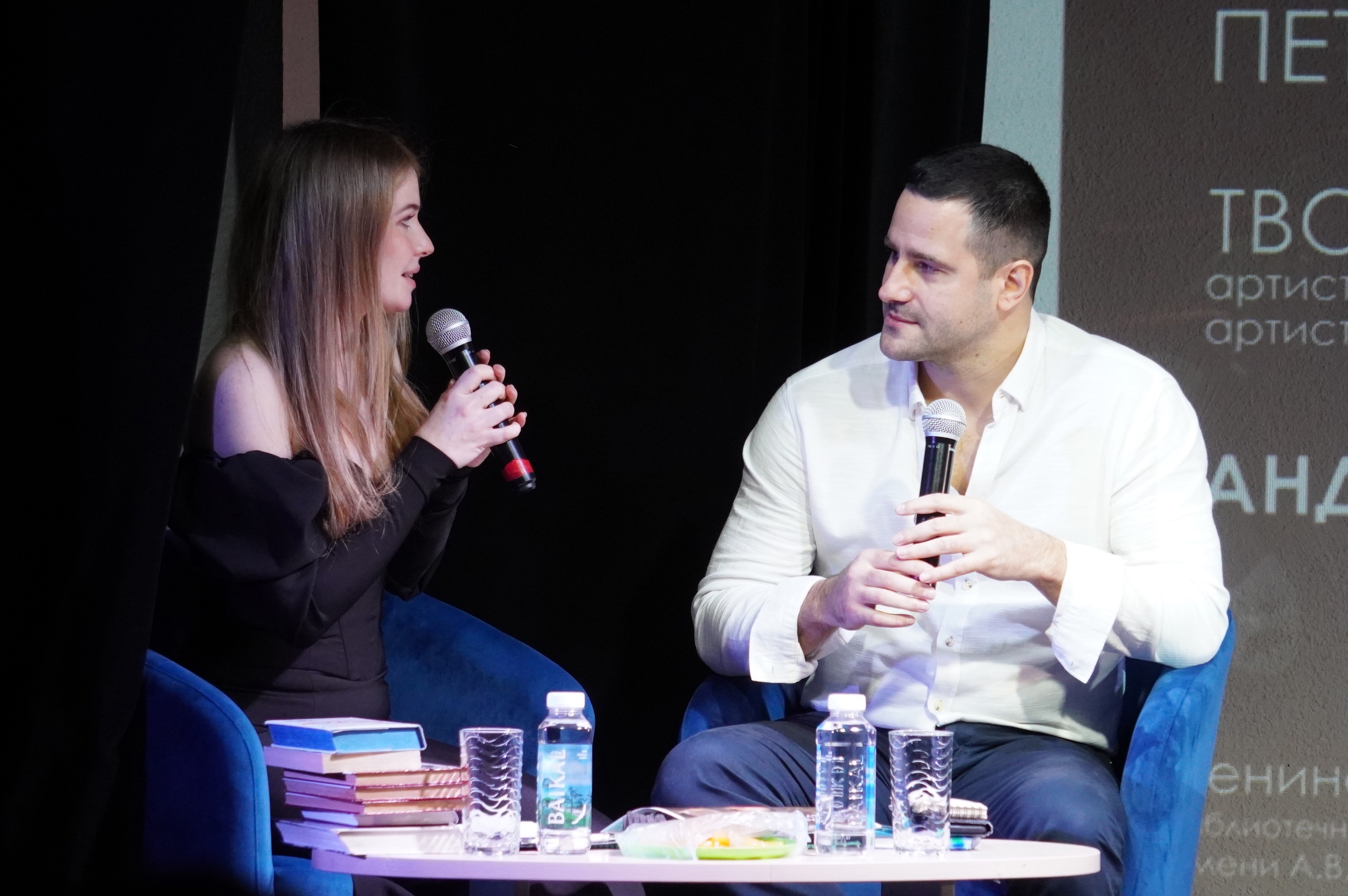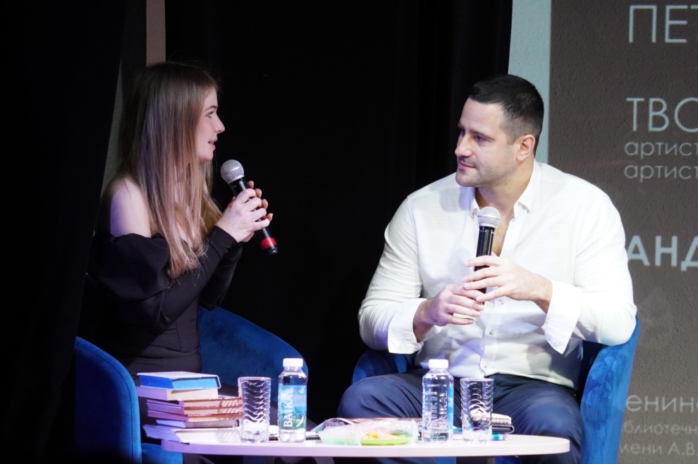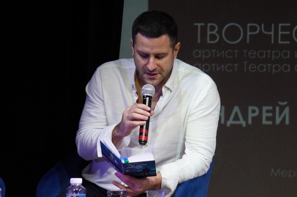 Модератор встречи Юлия Абрарова задавала вопросы Андрею Вергелису о его творческом пути, актёрских работах в театре и кино, а также о поэтической деятельности.