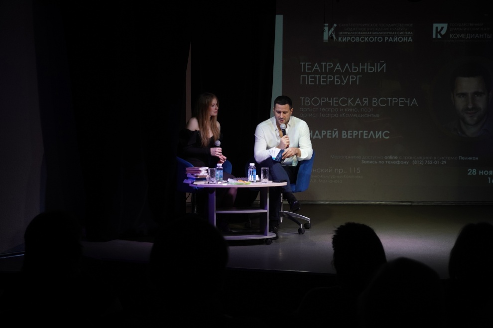 28 ноября в Библиотечно-культурном комплексе им. А. В. Молчанова в рамках проекта «Театральный Петербург» состоялась творческая встреча с артистом театра и кино, поэтом, артистом Театра «Комедианты» Андреем Вергелисом.