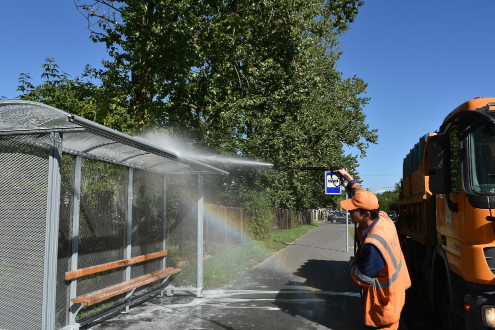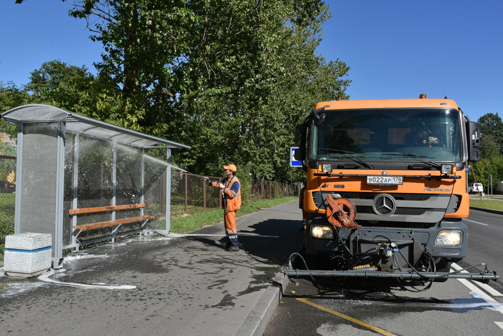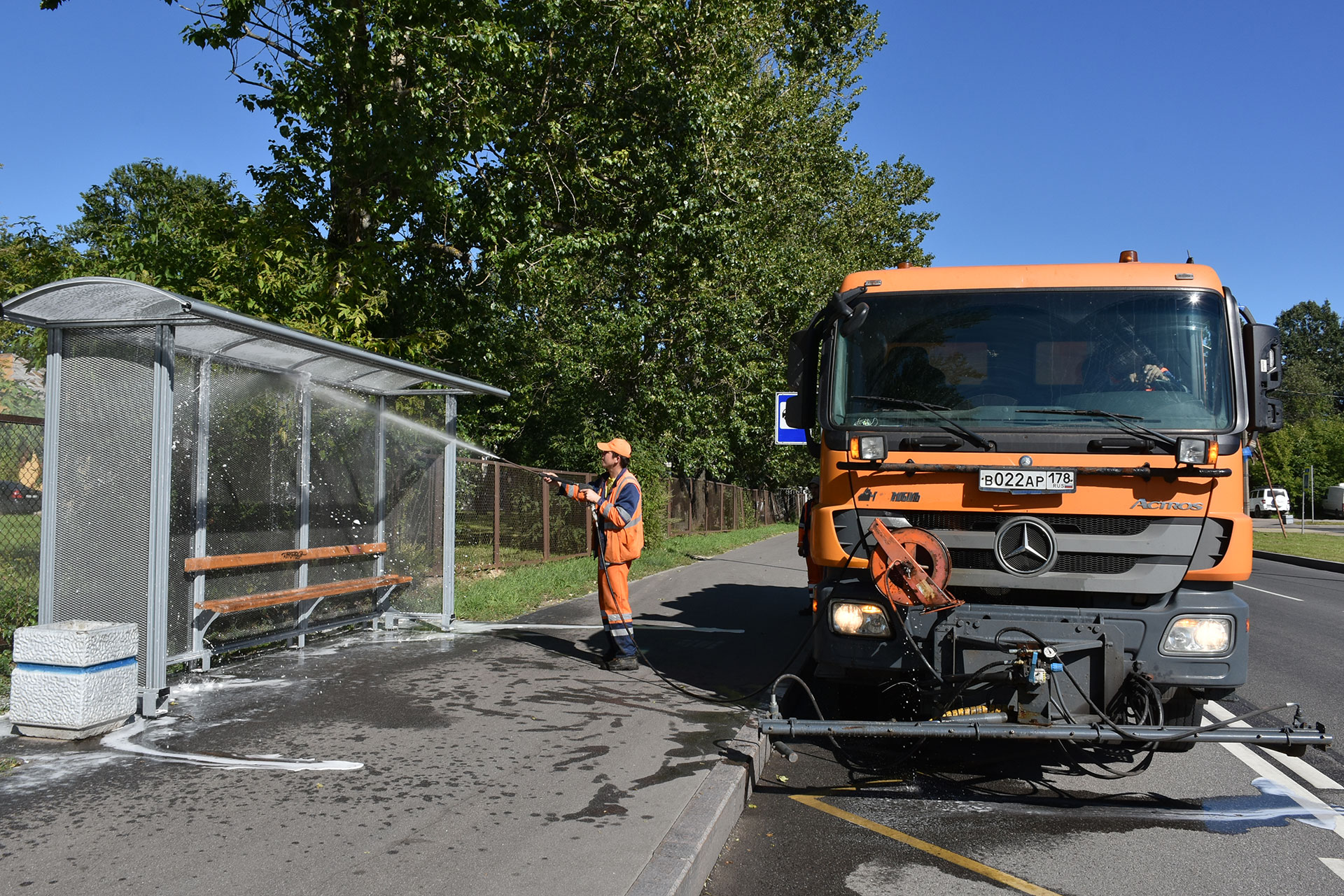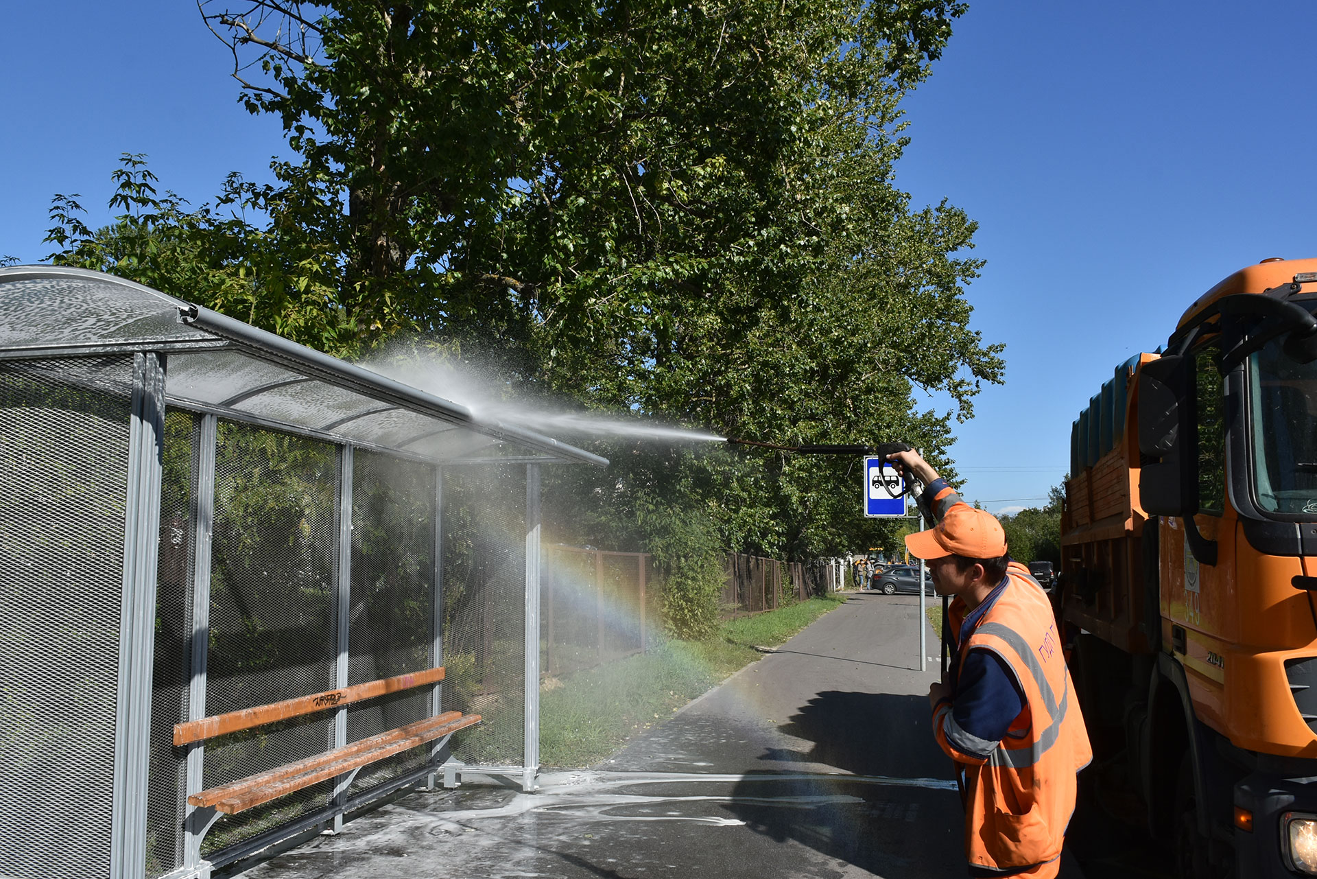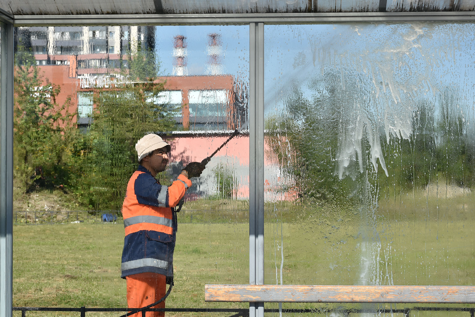 В Кировском районе продолжается мойка и дезинфекционная обработка павильонов ожидания городского пассажирского транспорта