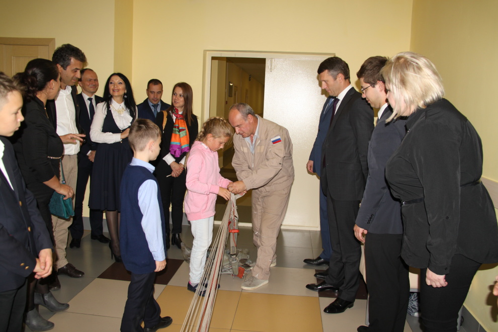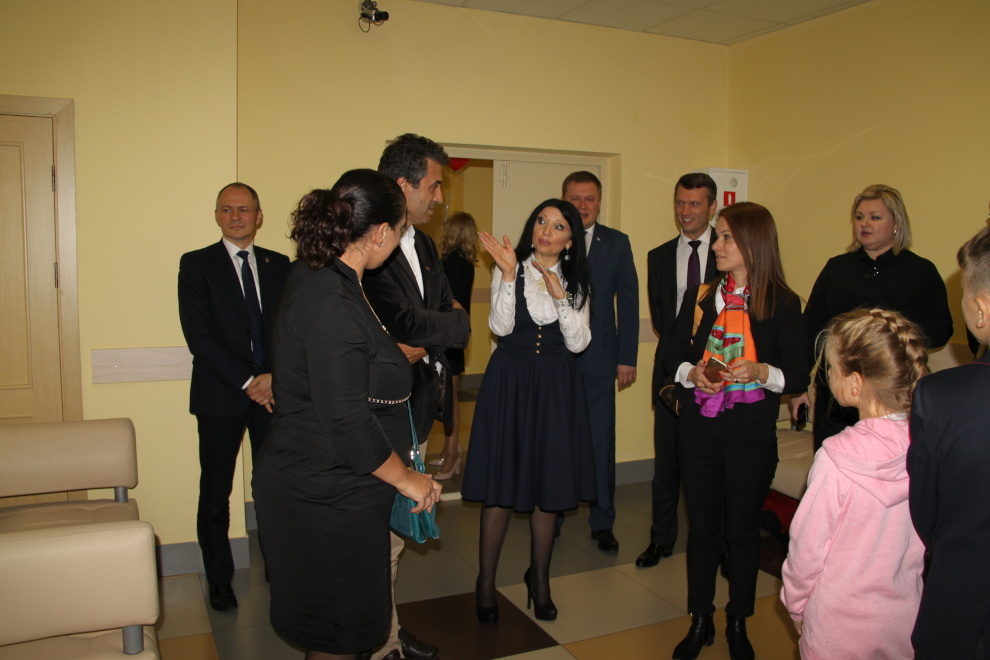 Ученики школы встретили делегацию в национальных костюмах с караваем, а директор школы Анна Малая провела экскурсию по школе. Она показала творческие лаборатории и арт-пространства, бассейный комплекс, зал для занятий Ушу и Тайхвандо, где дети показали своё мастерство, а также планетарий, концертный зал, библиотечный комплекс и виртуальный филиал Русского музея.