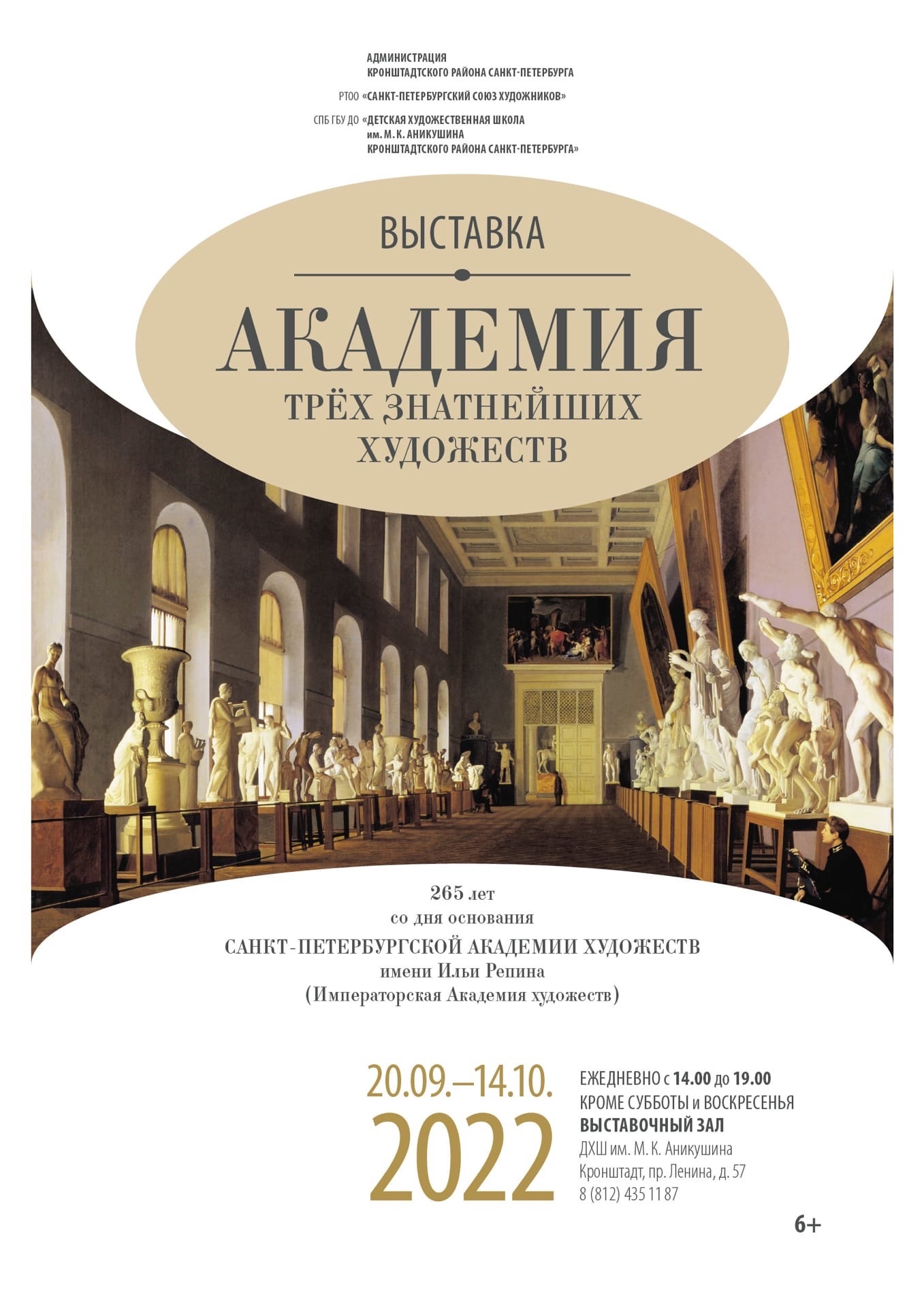 20 сентября в 17.30 в Художественной школе Кронштадта состоится торжественное открытие выставки «Академия трёх знатнейших художеств», посвящённая 265-летию со дня основания Санкт‑Петербургской Академии художеств имени Ильи Репина.