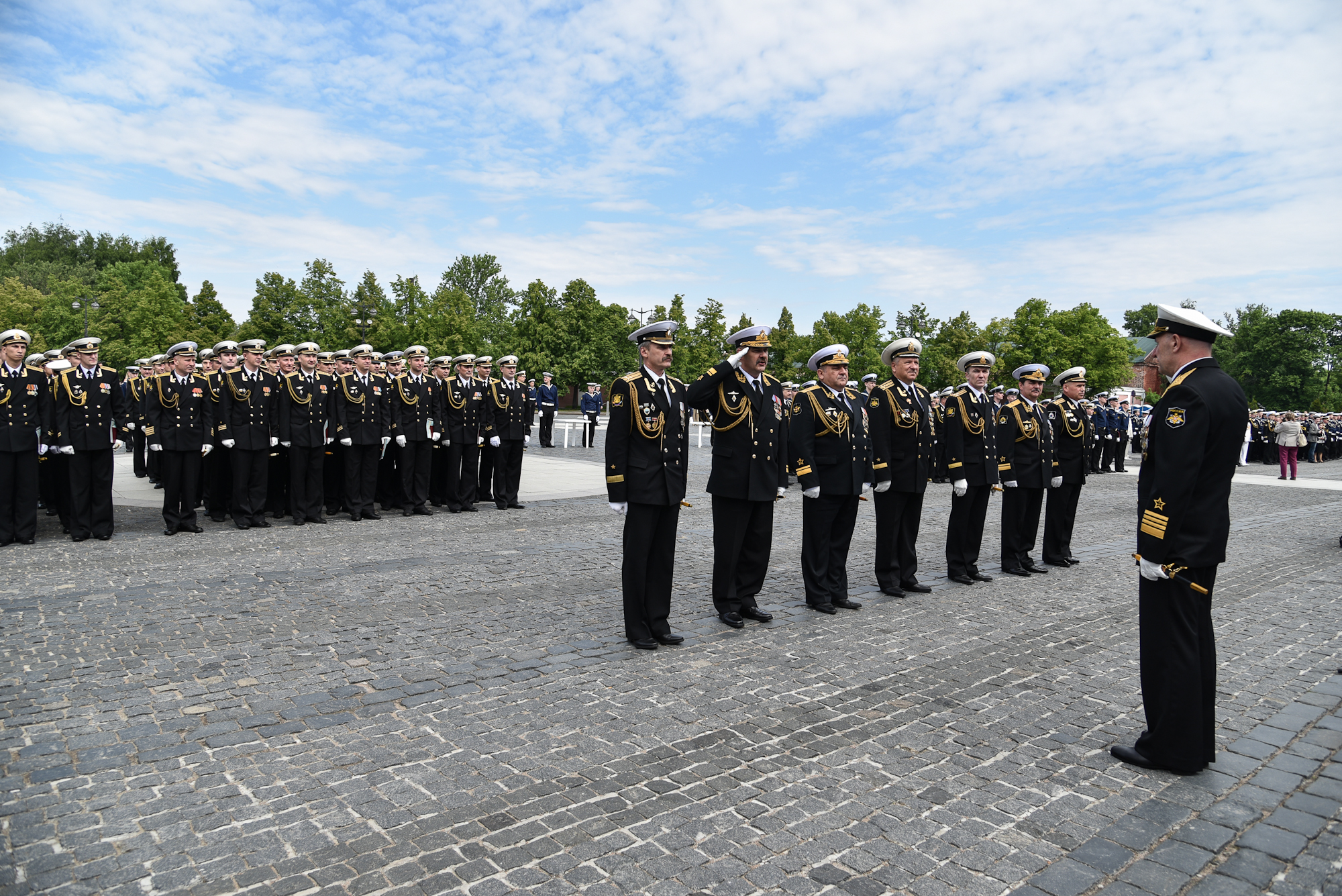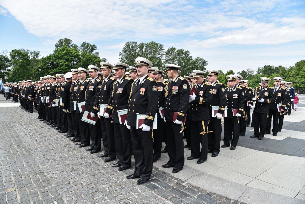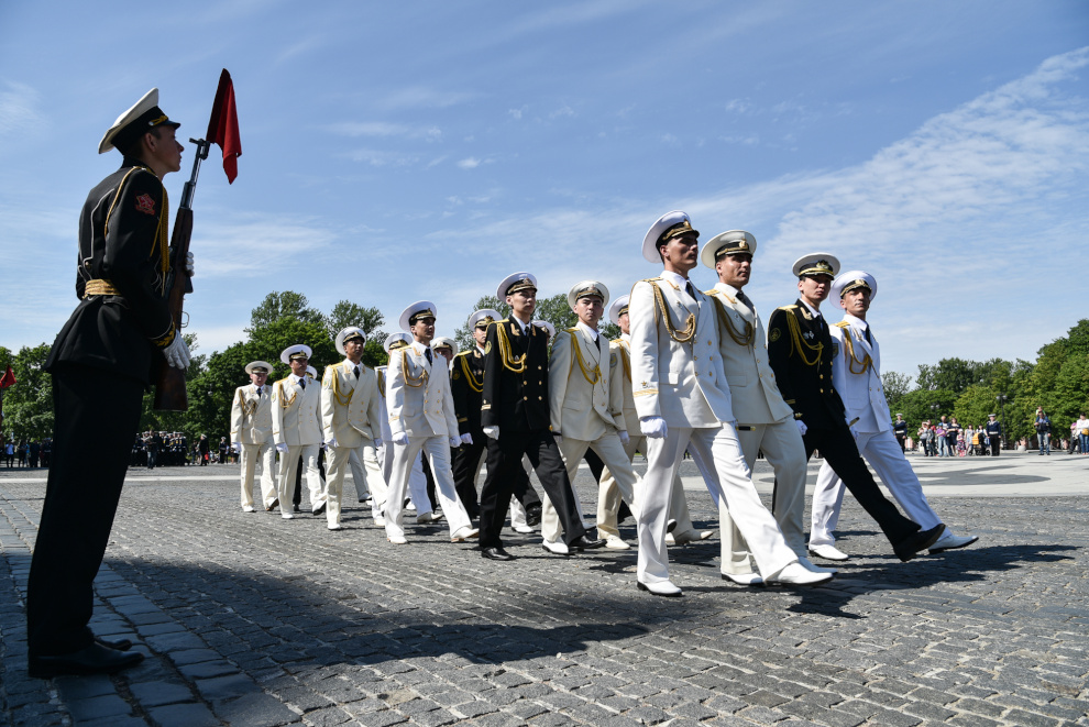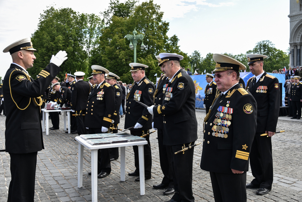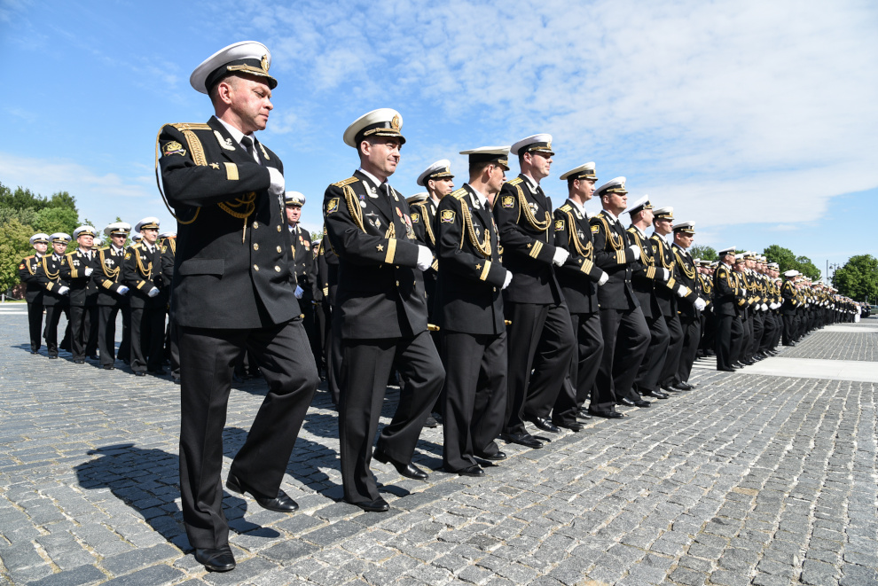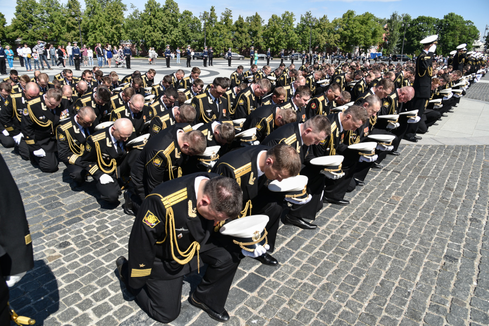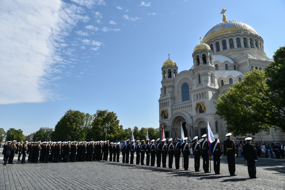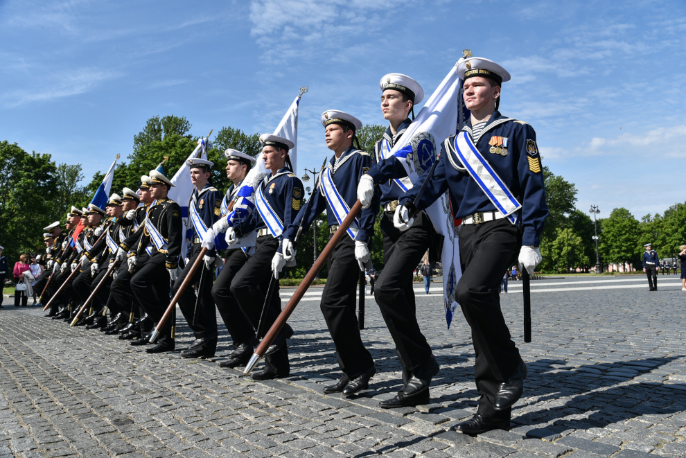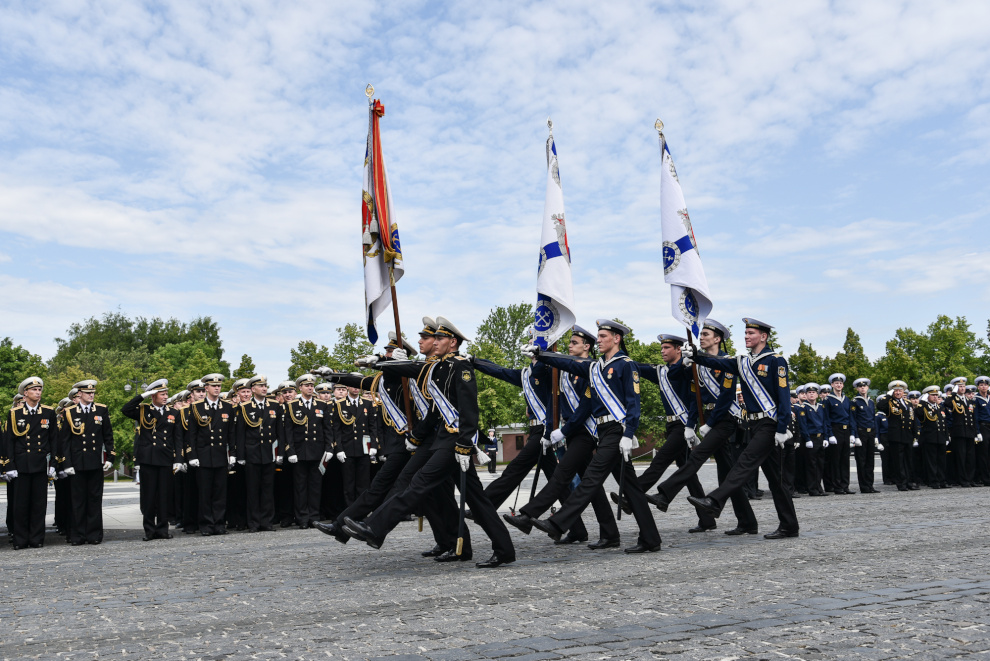 На Якорной площади состоялось проведение воинского ритуала вручения выпускникам Военно-морских учебных заведений Санкт‑Петербурга аттестатов, дипломов, кортиков, производство в офицеры.