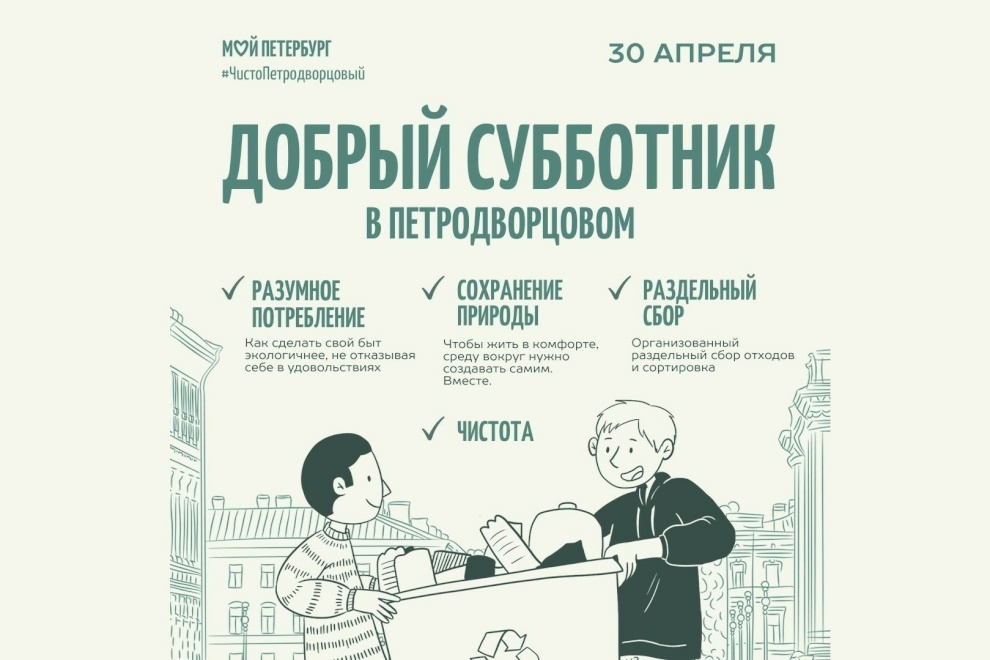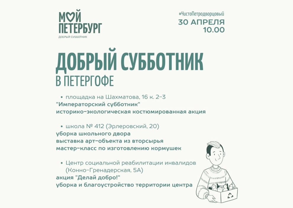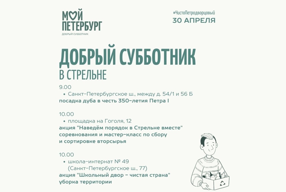 В Стрельне Добрый субботник организуют на трёх площадках. На ул. Гоголя, 12 пройдут соревнования по сбору вторсырья и мастер-классы. Генеральная уборка территории состоится в школе-интернате №49, а на Санкт‑Петербургском пр., 54/1 – посадка дуба в честь 350-летия со дня рождения Петра I.