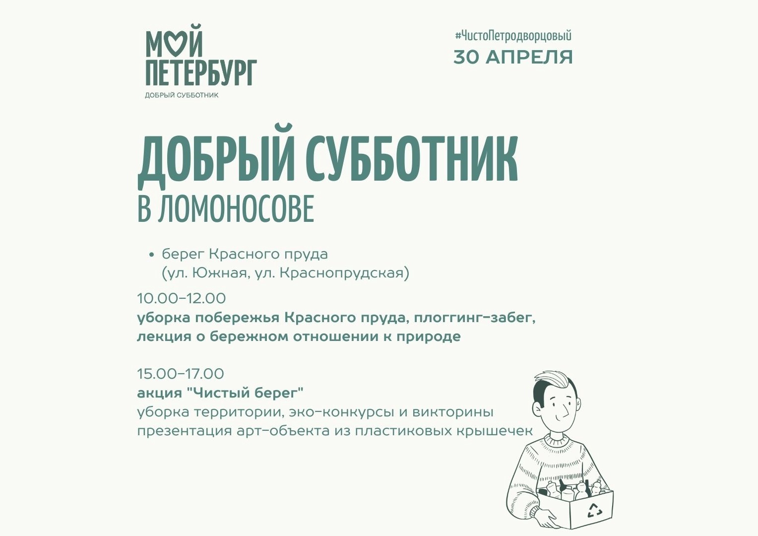 В Ломоносове на берегу Красного пруда можно присоединиться к эко-акции "Чистый берег". В 10.00 плоггинг-забег (сбор максимального количества мусора на время) организует муниципалитет. В 15.00 эстафету добра принимают волонтёры ПМЦ. Будет представлен арт-объект из пластиковых крышек, пройдут конкурсы и викторины на экологическую тематику.