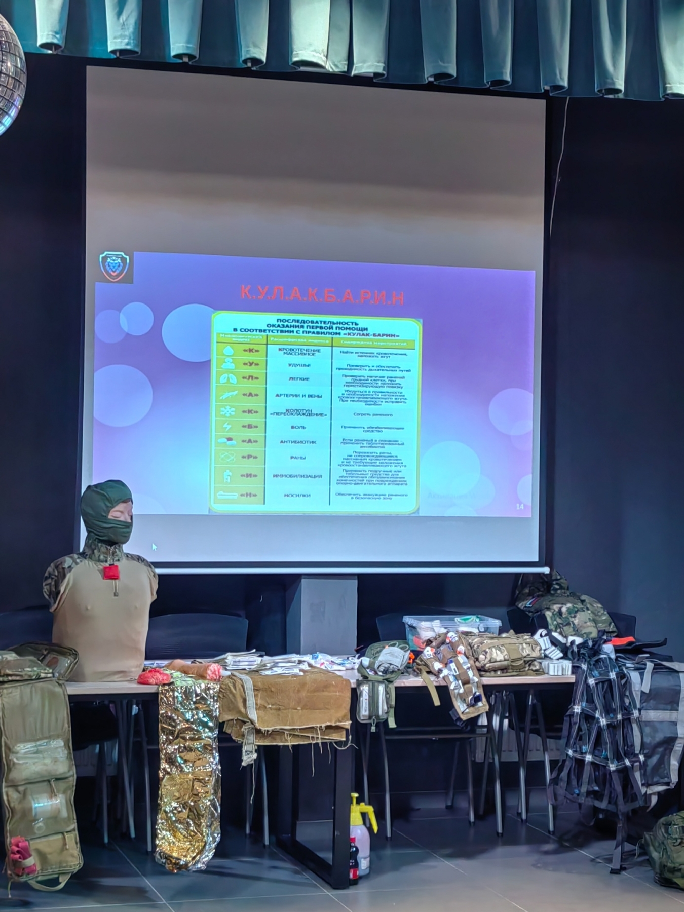 Участникам встречи рассказали об алгоритме «К.У.Л.А.К. Б.А.Р. И.Н.», в названии которого каждая буква соответствует определённым манипуляциям, расставленным по приоритету. И показали этот алгоритм на практике. Выполнить «Кулак барин» может любой человек, для этого не нужно медицинское образование.