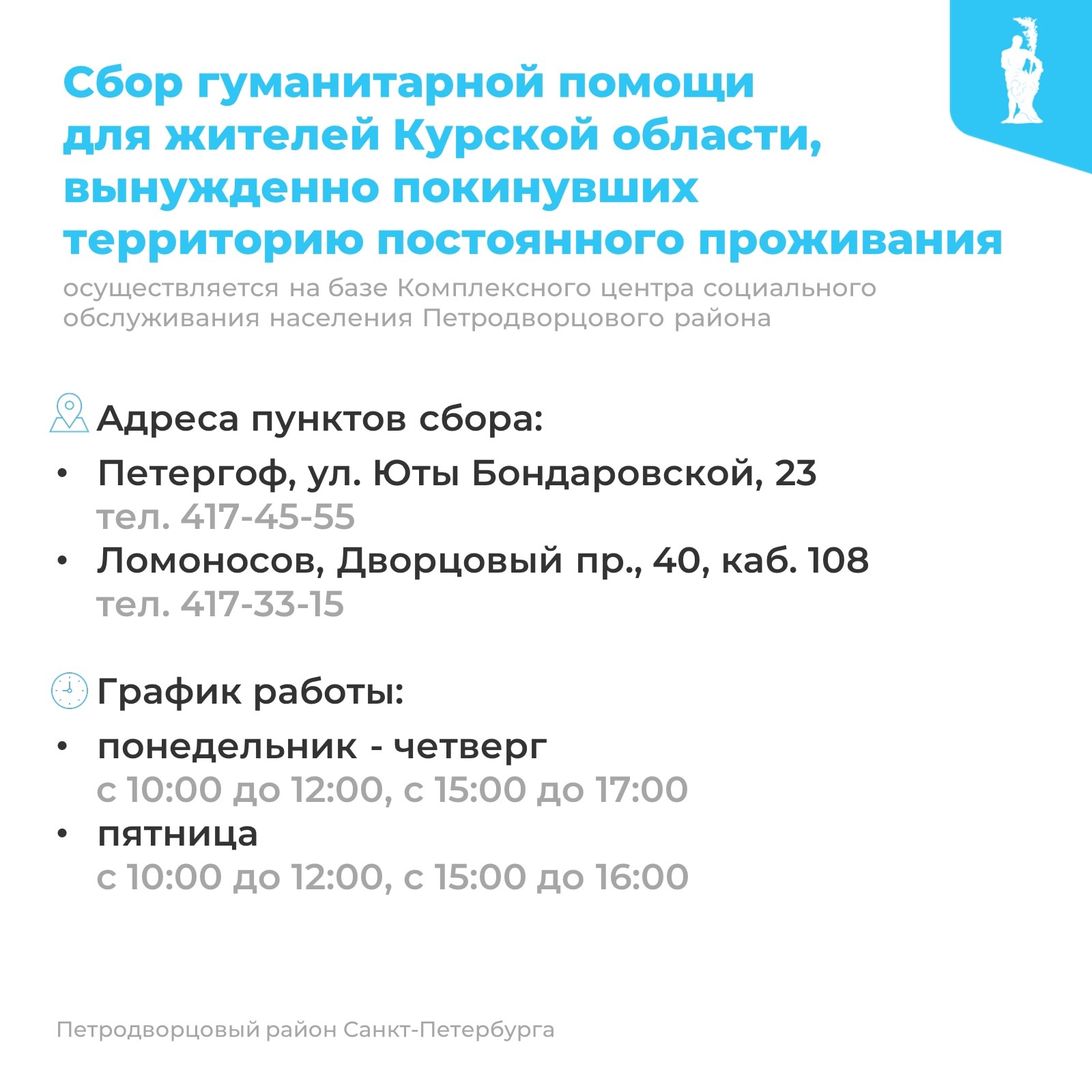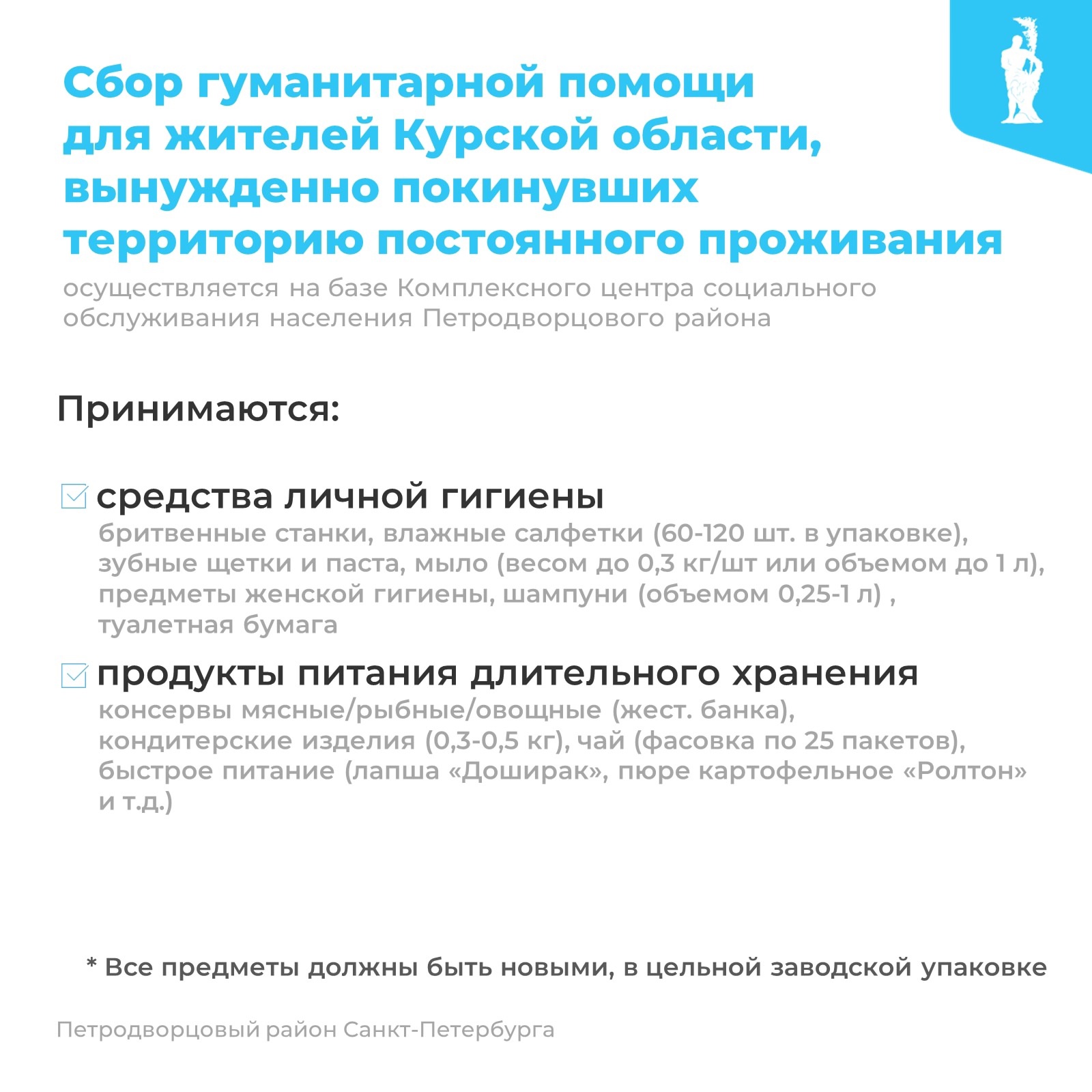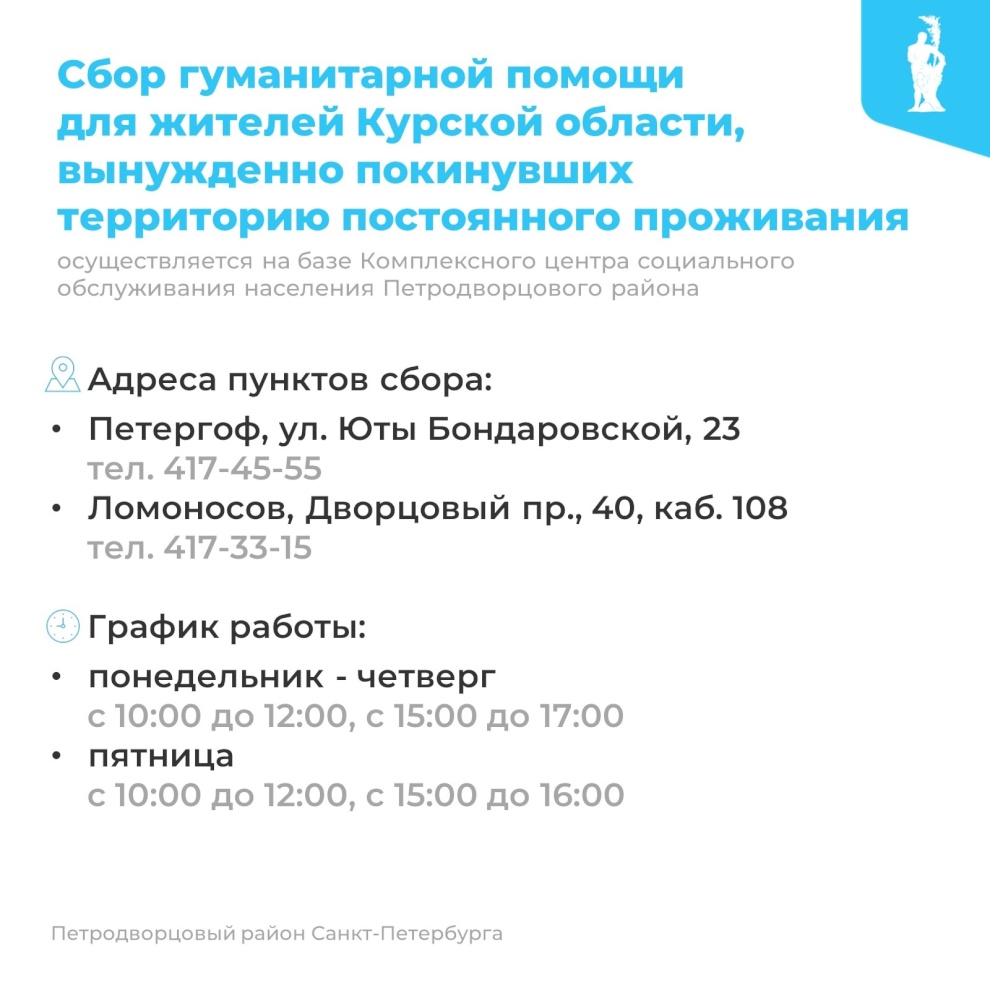 В Петродворцовом районе продолжается сбор гуманитарной помощи для жителей Курской области, вынужденно покинувших свои дома из-за обстрелов