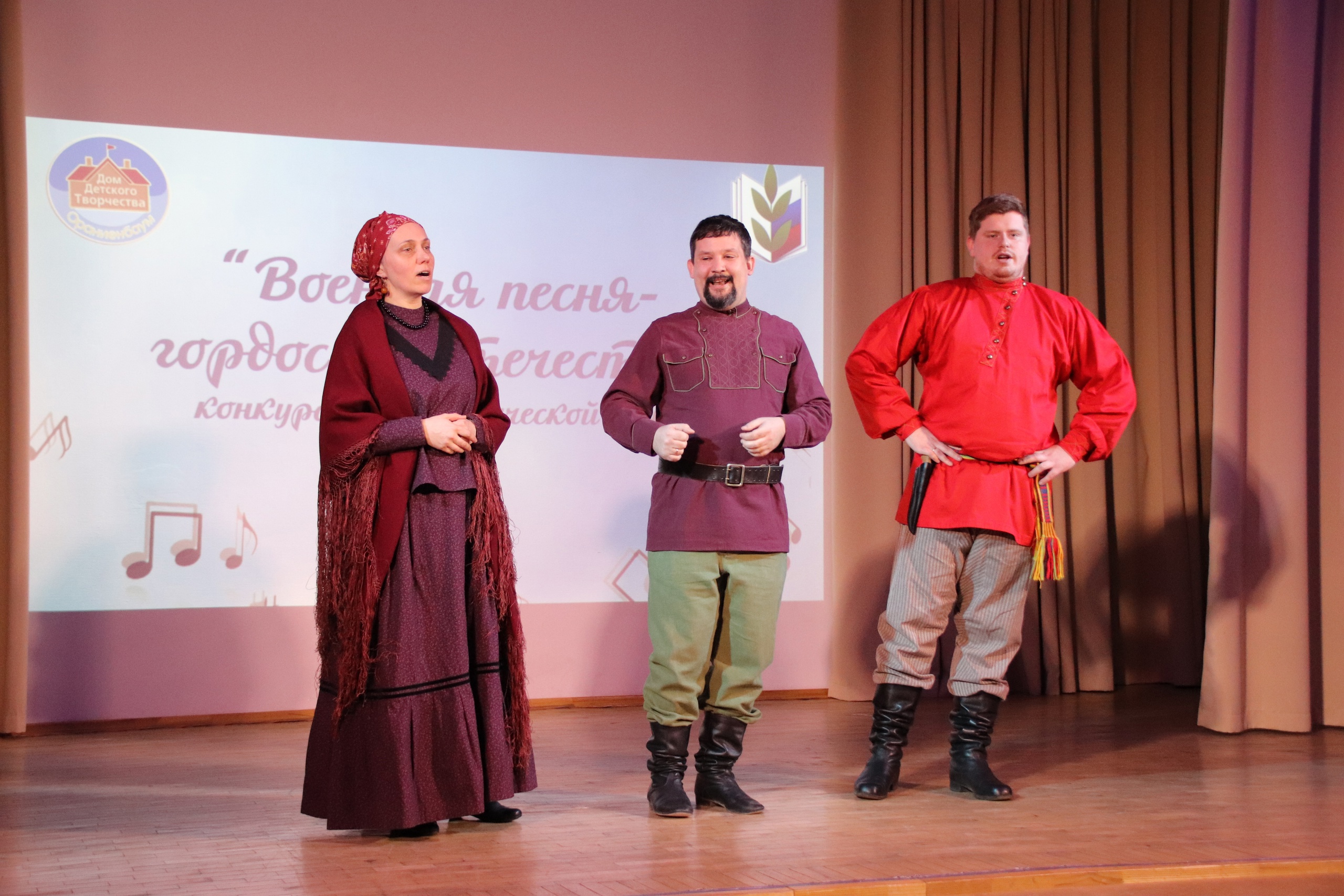В Доме детского творчества «Ораниенбаум» прошёл отборочный этап конкурса военно-патриотической песни «Военная песня – гордость Отечества». Организаторы конкурса – Территориальная организация Петродворцового района Санкт‑Петербурга, отдел образования Петродворцового района Санкт‑Петербурга и Дом детского творчества «Ораниенбаум».