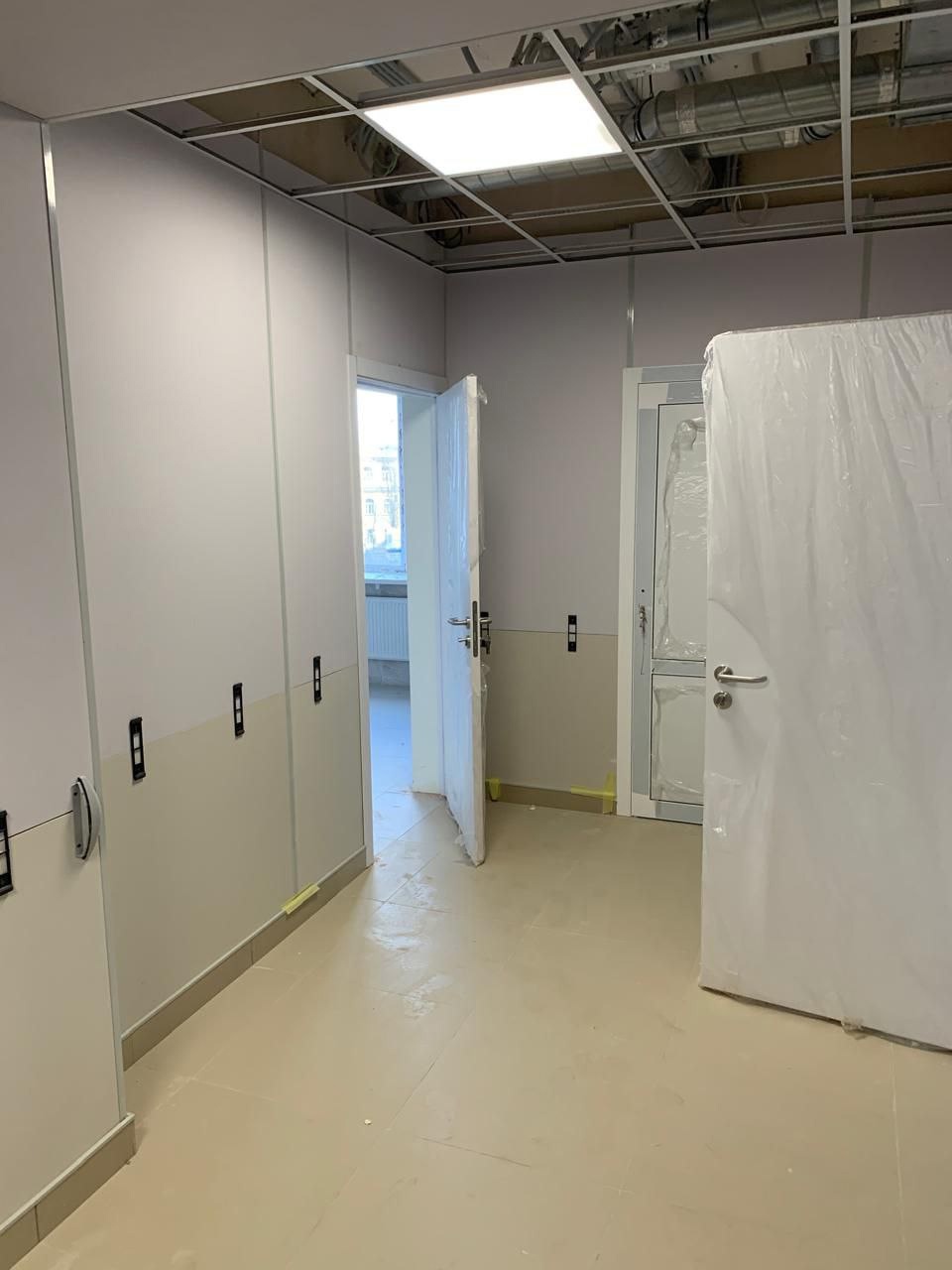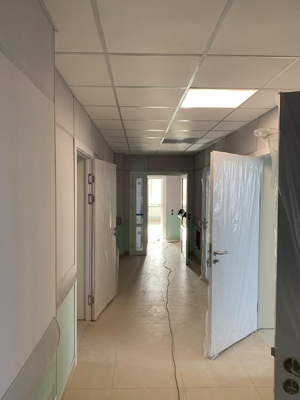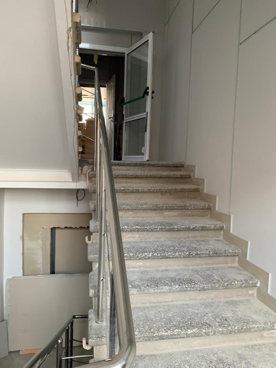 Работы ведутся во втором крыле здания: отделка лестничных маршей, устройство подвесных потолков, монтаж дверных блоков, установка сантехнического оборудования, монтаж слаботочных систем и электрики.