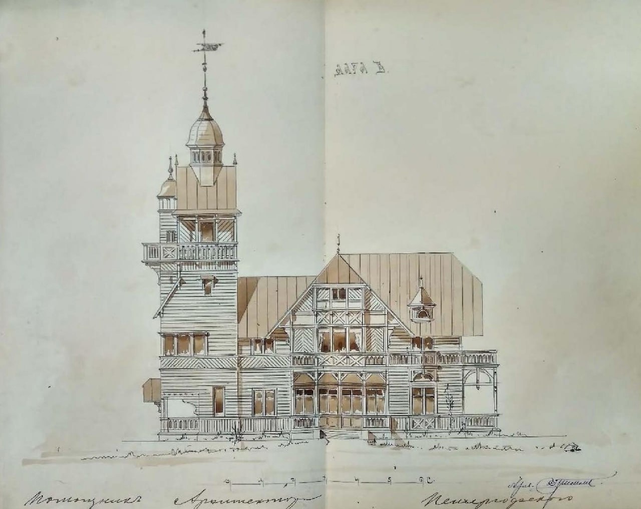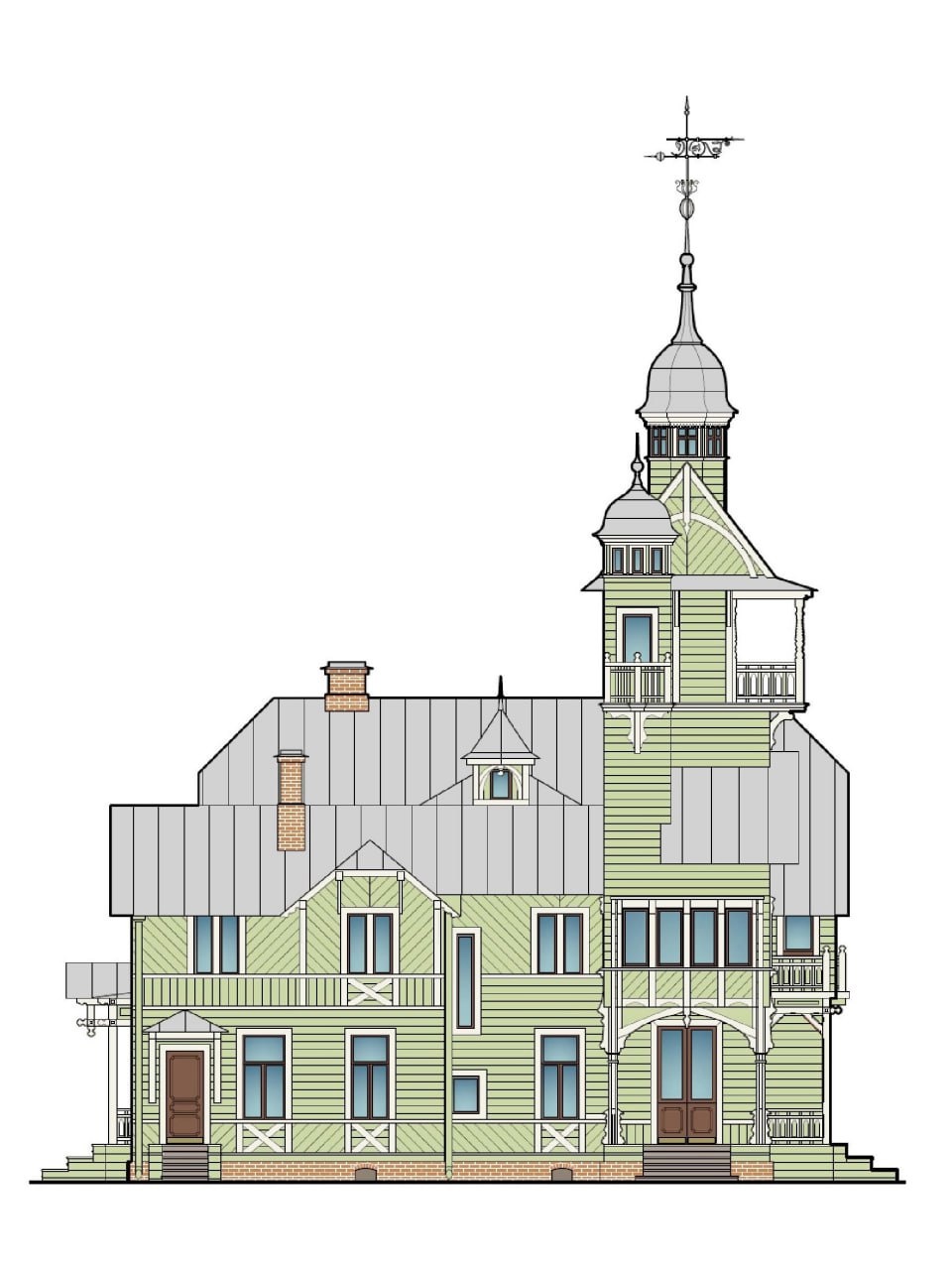 Проектной документацией предусмотрено восстановление объемов здания из деревянных материалов и внешнего облика фасадов, включая балконы, обшивку стен, наличники окон, резные балясины и консоли, печные трубы, кровли, башенки со шпилями, флюгер, декоративные элементы фасадов, дверных и оконных заполнений.