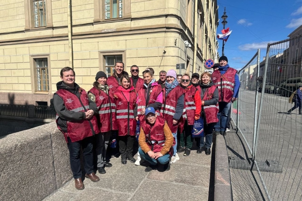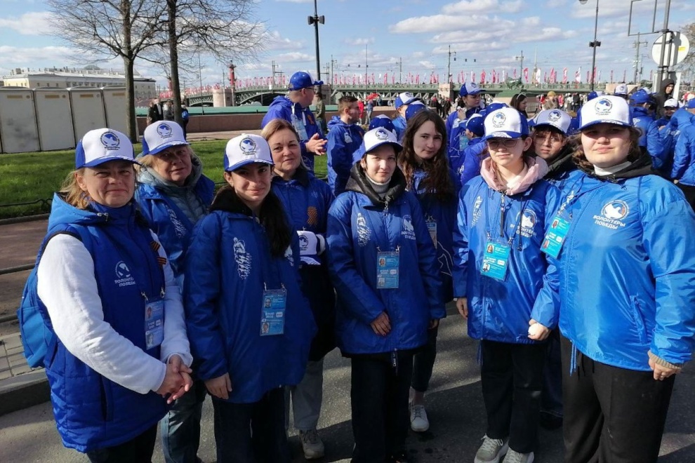 Важным моментом церемонии стало торжественное развёртывание волонтёрами Победы легендарного Знамени Победы. К Дворцовой площади главный символ народного подвига несли и шесть добровольцев из Петродворцового района. Всего же в проведении шествия помогали 16 дружинников и 10 волонтёров из нашего района.