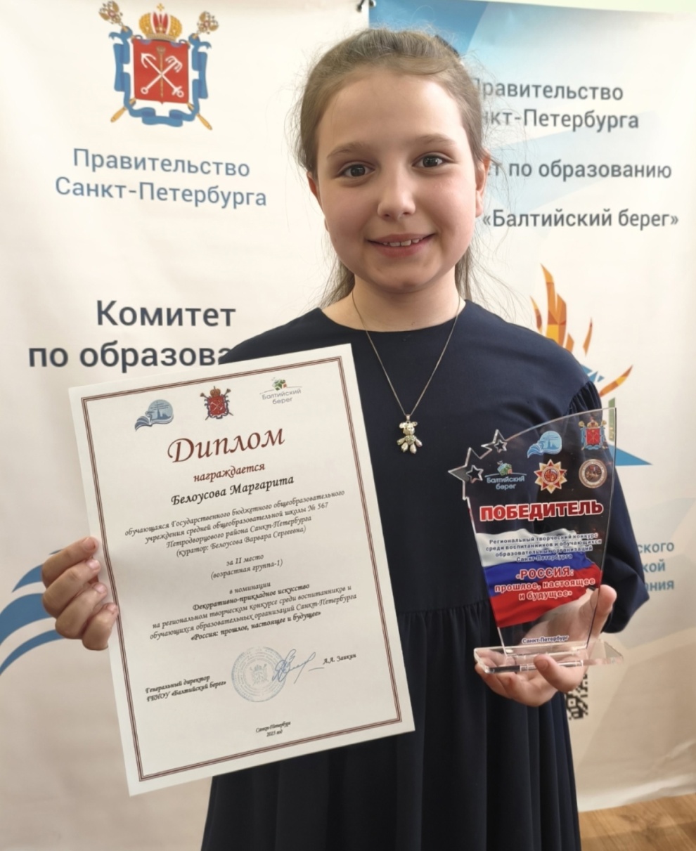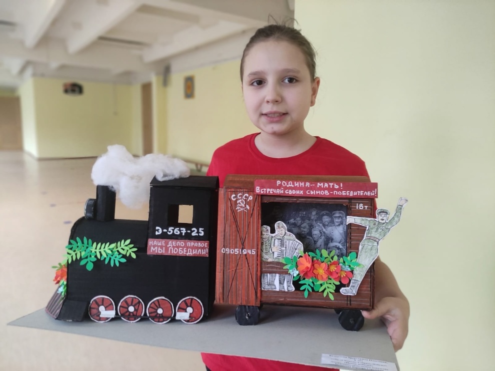 Ученица третьего класса школы № 567 Петродворцового района Маргарита Белоусова посвятила свою работу четырём прапрадедушкам, защищавшим нашу Родину в годы Великой Отечественной войны. Её «Поезд Победы» покорил судей масштабом и точностью исполнения, творческим подходом и историческим контекстом. Маргарита стала победителем в номинации «Декоративно-прикладное искусство».