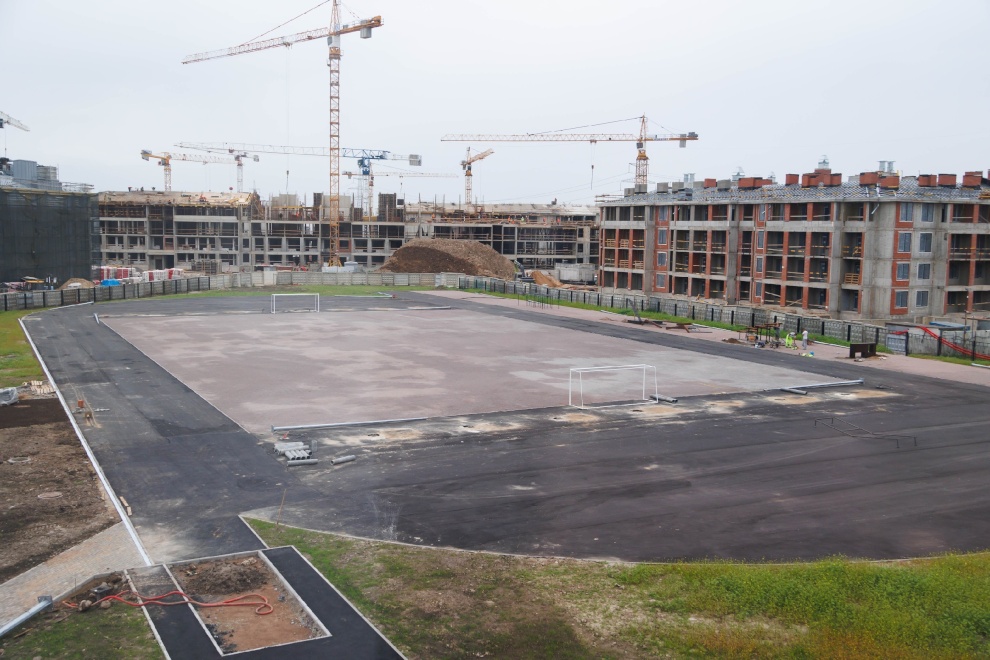Размеры школьного двора позволят разместить большой стадион с футбольным полем и беговыми дорожками, различные площадки для отдыха и досуга детей.
