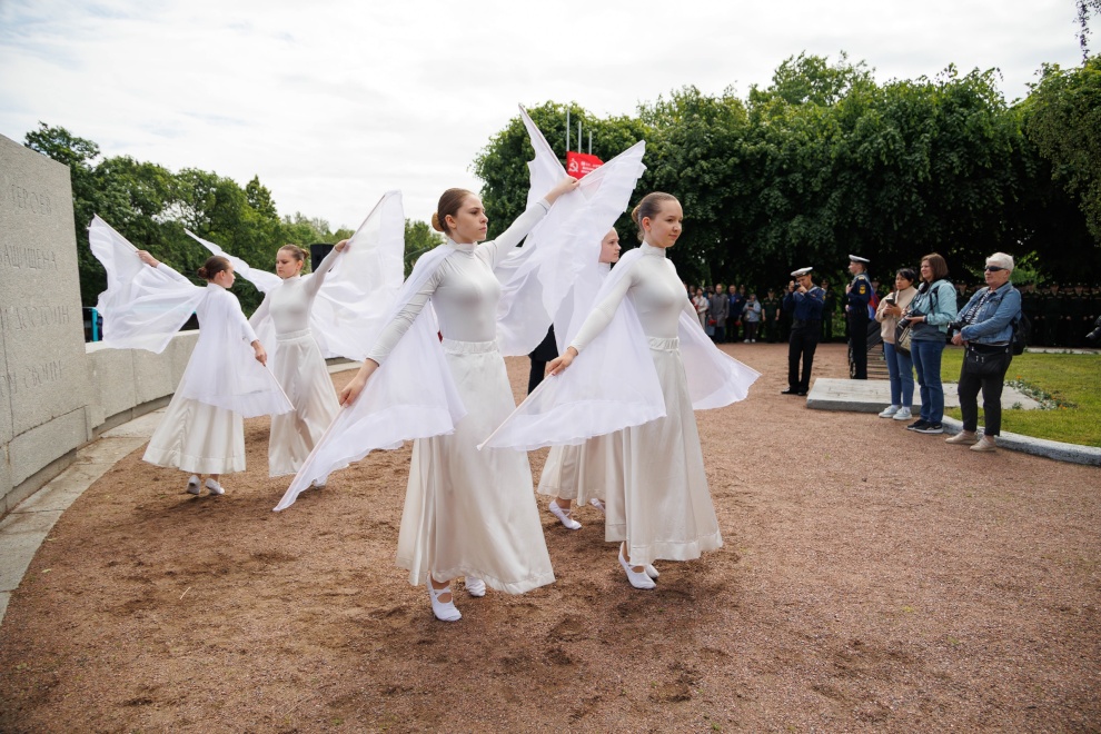 В память о жертвах войны прозвучали проникновенные стихи и песни, состоялось торжественное прохождение войск, дислоцирующихся на территории Петродворцового района.