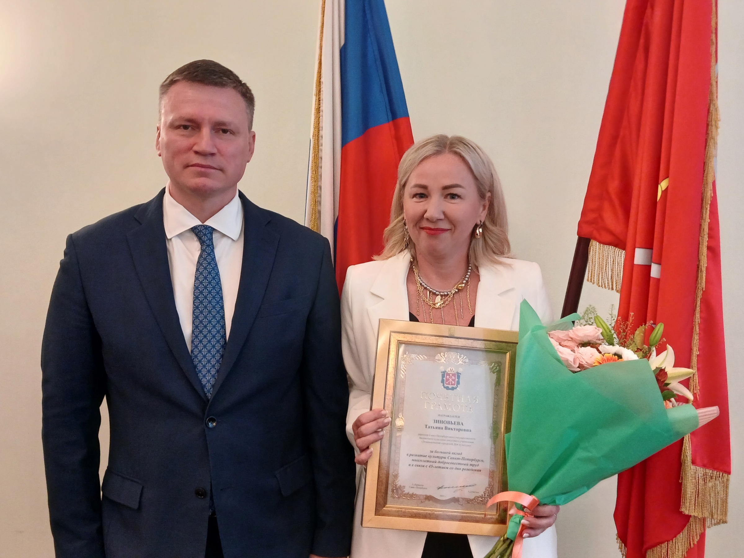 Приятную миссию выполнил глава администрации Александр Якушев, он вручил заслуженную награду и поблагодарил Татьяну Зиновьеву за многолетний добросовестный труд в подведомственном учреждении, за заслуги в содействии культурному развитию Петербурга и Петродворцового района.